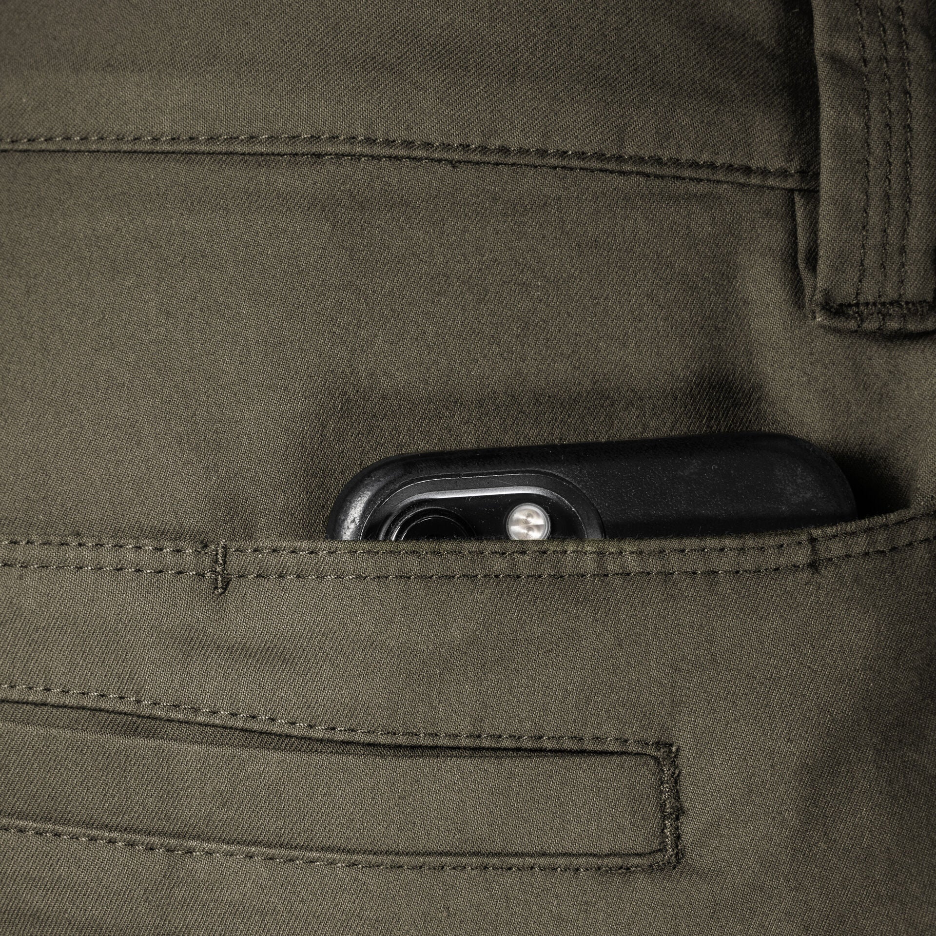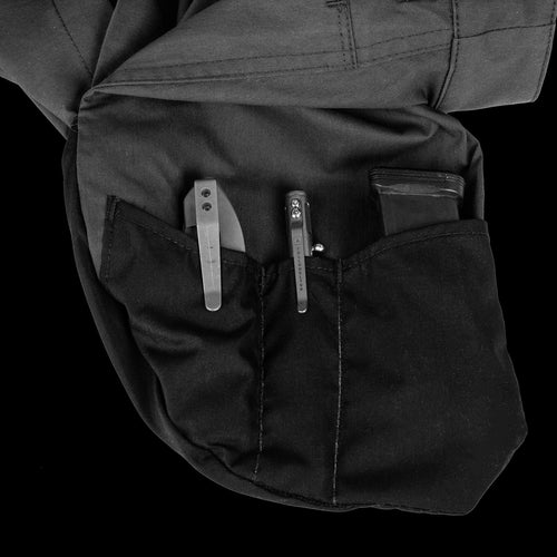 Concealed pockets on the yoke can secure your common tools of the trade comfortably, even when seated.