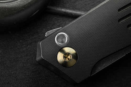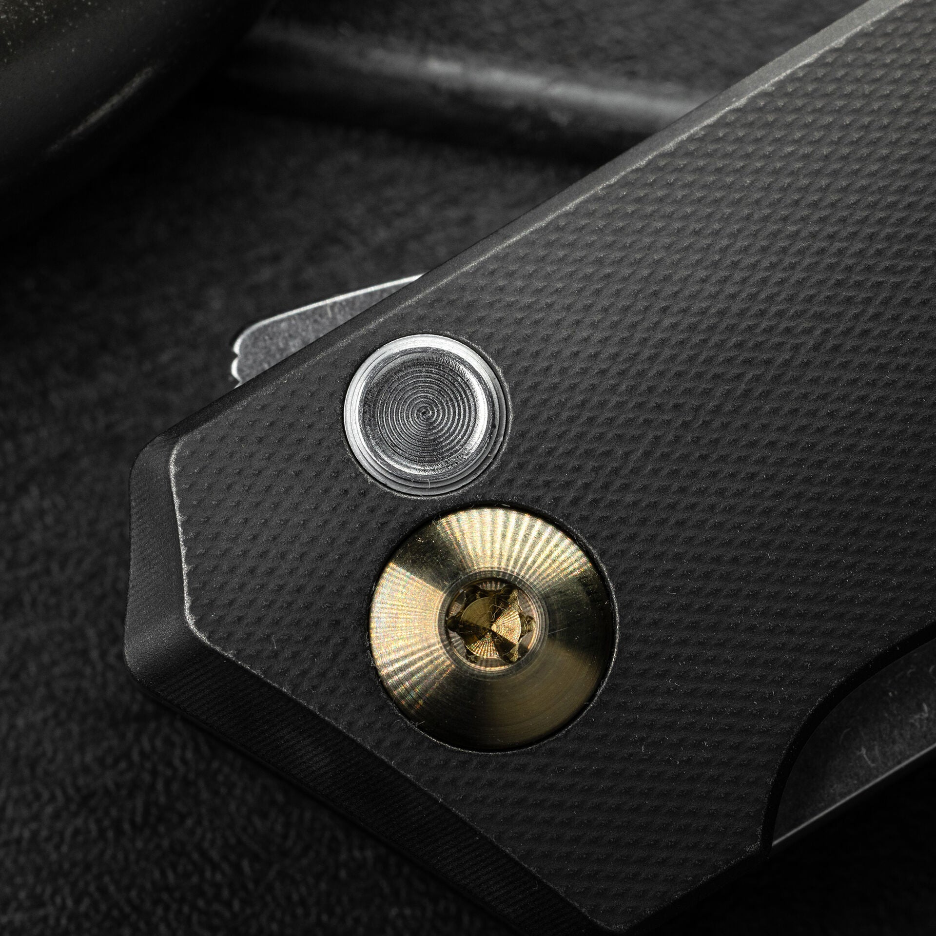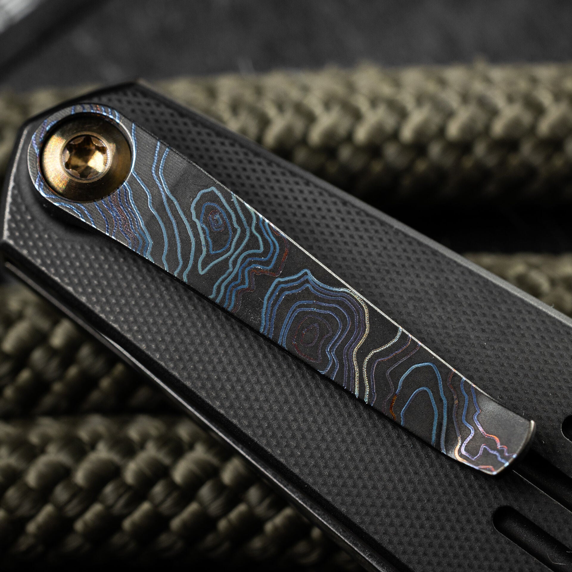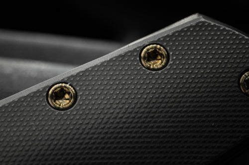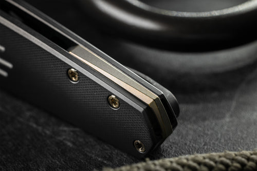 Crafted with great care and precision, the titanium chassis features bronzed pivot, button lock, backspacer and lanyard attachment point. The full assembly that combines the handle scales with the chassis is held together securely with three bronzed titanium screws on the back of the handle.