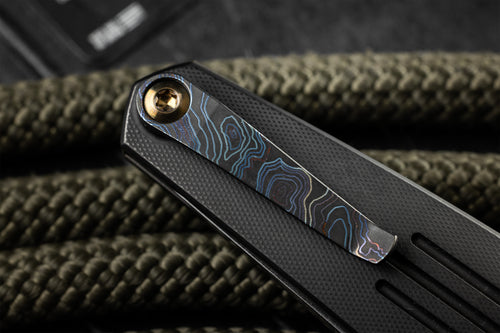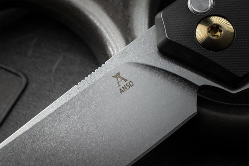 This edition features titanium scales with triple fullers and our logo opposite Ansos on the blade. The frames and clip are DLC coated and our signature topo laser applied onto the titanium pocket clip.