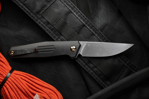 The Toko by Anso Designs is a larger gentleman's style pocket knife, flawlessly finished in the clean aesthetic that Jens is known for. The Toko is a versatile utility folding knife perfect for every day carry. The unique chassis construction emphasizes the simple yet detailed design language, making it an ideal companion for those who appreciate both form and function. Its extremely lightweight construction is achieved through innovative “Mud-Track” milled weight-reduction pockets inside the frame, allowing the TOKO to virtually disappear in your pocket.