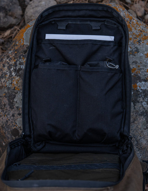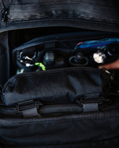 The spacious main compartment features a single full-height vertical pocket and two gusseted half-height pockets to compartmentalize critical gear for immediate access in constrained spaces such as car and airplane seats.