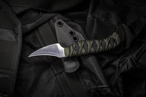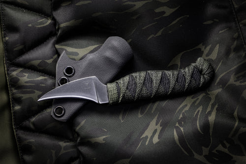 The FKR is made of 3V and features a convex ground edge for impressively clean, razor-sharp cuts. A thin, flat blade keeps the knife fast and light to work with. The full size, resin-soaked cord wrapped handle offers exemplary grip. A user configurable hook sheath is compatible with soft loops with Pull-The-DOT snaps, shock cord or pocket carry.
