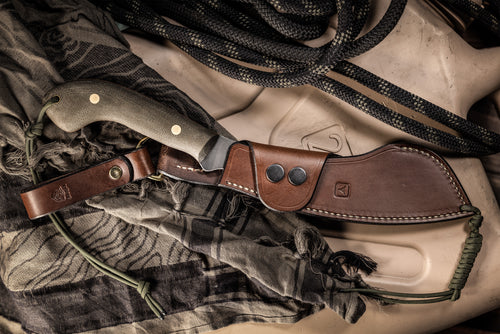 The Pocket Parang comes with a right hand scandi-style smoky brown sheath and green paracord leg tie. This low maintenance sheath has its own natural locking system as well as an extra soft loop strap to lock the blade in place when on the trail. Expertly designed and beautifully crafted, the versatility of the Pocket Parang makes for a reliable companion under any circumstance.