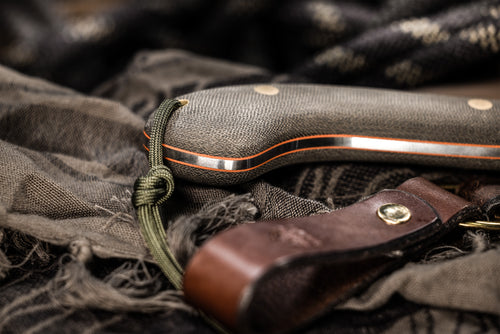 With an overall length of 13.5” inches, the Pocket Parang is eminently portable. This Pocket Parang is made from .137” O1 tool steel, renowned for edge holding and toughness. The 7" blade has a curved cutting edge for efficient slicing ability. The overall size makes it suited to carry with you on a walk or fishing trip. The handle is made from polished green canvas Micarta with thin orange G10 liners and has brass pins. It has the addition of a more pronounced finger guard which means that there is a positive grip with no fear of your hand sliding towards the cutting edge even when cold and wet.