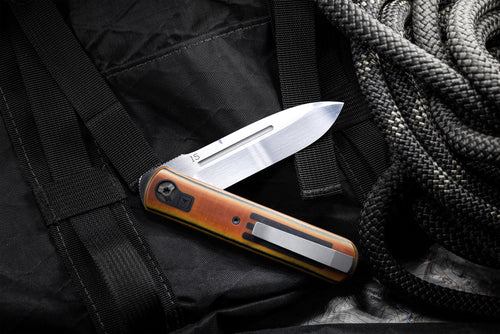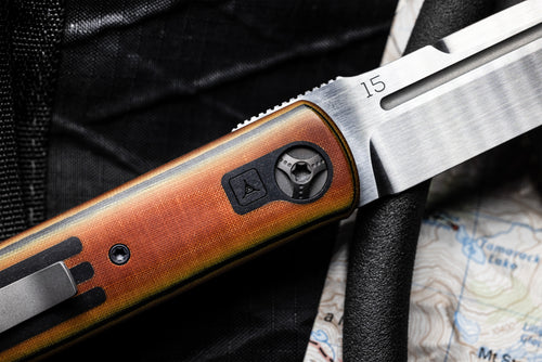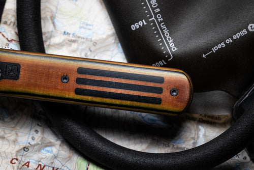 The handle assembly is a beautiful integration of materials and construction. The titanium liner lock has striking vintage Black Line Westinghouse overlays with our triple fullers milled deep and then filled with black Richlite. The pivot itself is stunningly constructed with custom titanium surrounded by a black Richlite pivot plate with our logo laser etched.