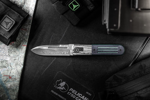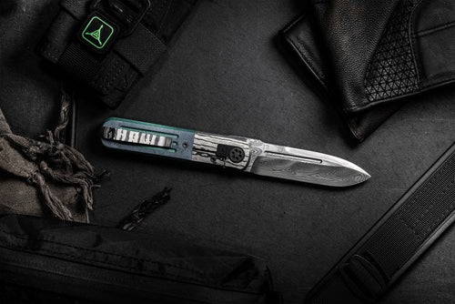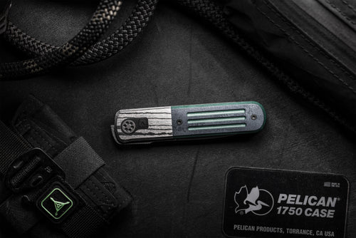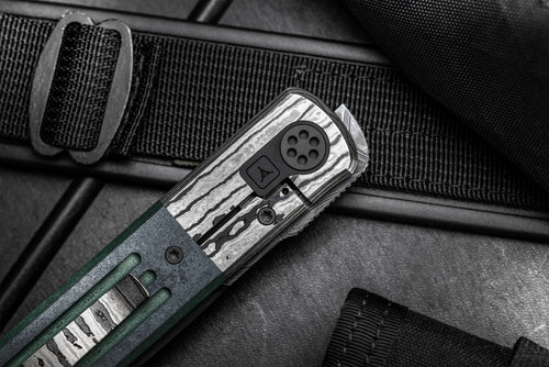 The handle assembly is a beautiful integration of materials and construction. The integral black Timascus bolsterlock frame has vintage green paper Micarta overlays with our triple fullers milled deep and black liners underneath. The pivot itself is stunningly constructed with custom titanium surrounded by a black titanium plate with our logo laser etched.