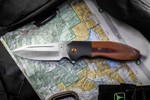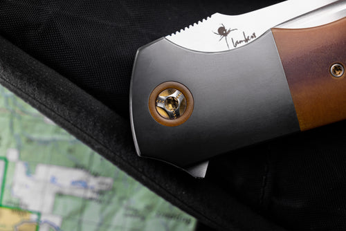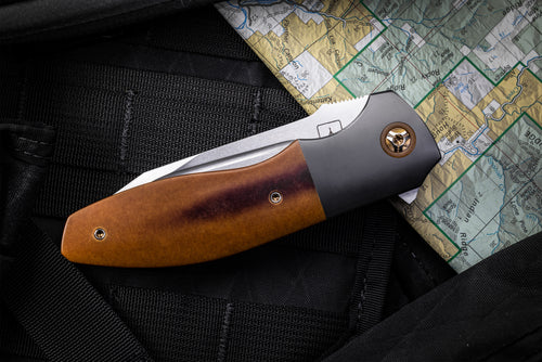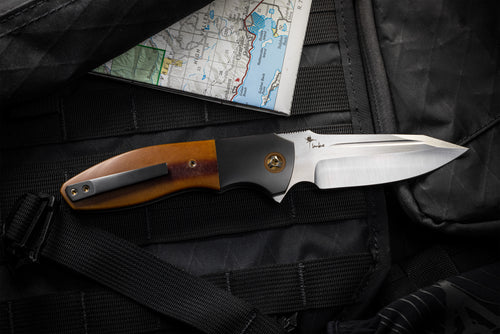 Kirby Lambert’s Dauntless 2.0 uses sweeping curves and long lines to create a refined, yet robust and utilitarian aesthetic. This full sized platform has been reimagined to be more lithe and sleek. This mid-duty folder was also built to be extremely capable and handle a multitude of cutting tasks. It features vintage paper micarta terminating in a zirconium bolster with custom pivot and beauty ring. The bayonet point flipper comes in Nitro V with a fuller riding under the swedge. Subtle and refined, the blasted Zirc bolster and pocket clip complement both builds. The overall pallet is tied together with Kirby's exemplary fit and finish.