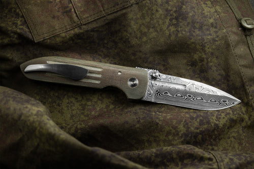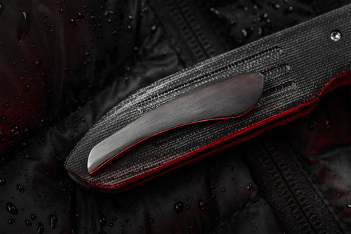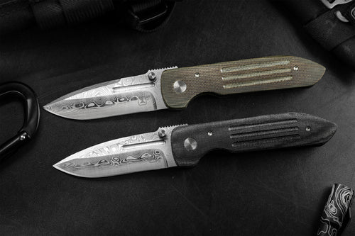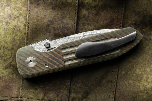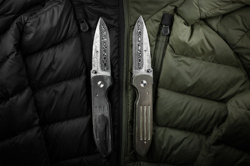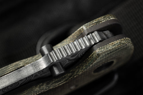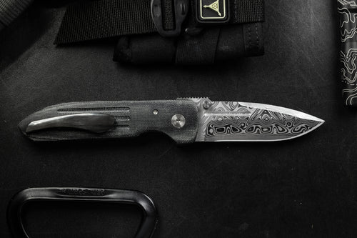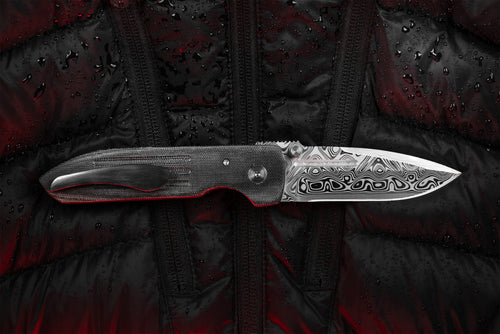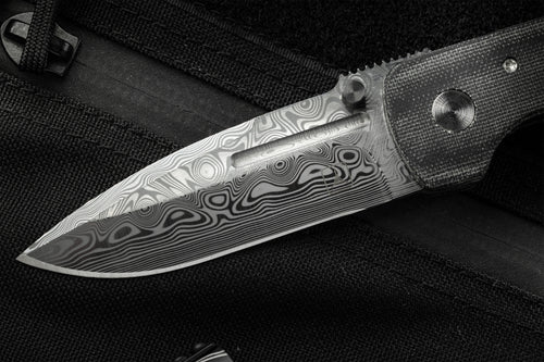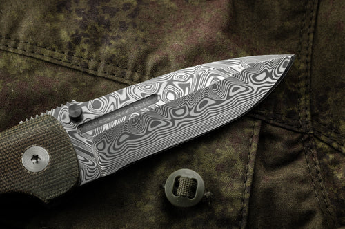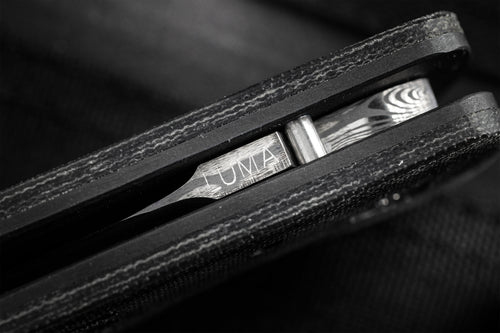 The Dauntless Elite Lumablades Edition further refines our Dauntless’ sleek aesthetic by removing the forward choil to maximize the cutting edge of the dramatic Damasteel blade. The familiar handle features are all there but in a liner lock frame with Micarta slab overlays. A deep front choil and geared Zirconium backspacer aid in grip while controlling the hollow ground, bayonet style blade. For easier field maintenance a captured bearing race ensures a smooth and fast deployment with dual Zirconium custom thumbstuds. On this custom edition the pocket clip is hand sculpted 705 zirconium.