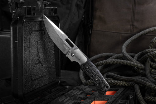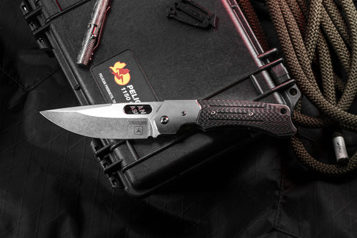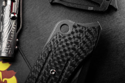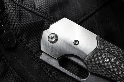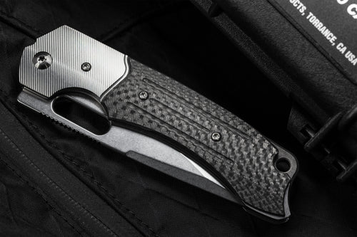 The heavily contoured carbon fiber slabs feature our triple fuller, and a machined titanium bolster. A drop point Magnacut blade balances a deep enough belly for slicing and terminates in a point acute enough for effortless piercing. Deep aggressive jimping on the spine and expert contoured slabs keep your hand locked in place, regardless of the task at hand. An oversized thumb cutout paired with cage bearings assures swift and positive deployment. The titanium liner lock assures the blade stays locked in place until the task is done. Finishing touches include a heavily jimped titanium backspacer, custom titanium pivot, and milled clip. Dervish and TAD logos are at the base of the blade.