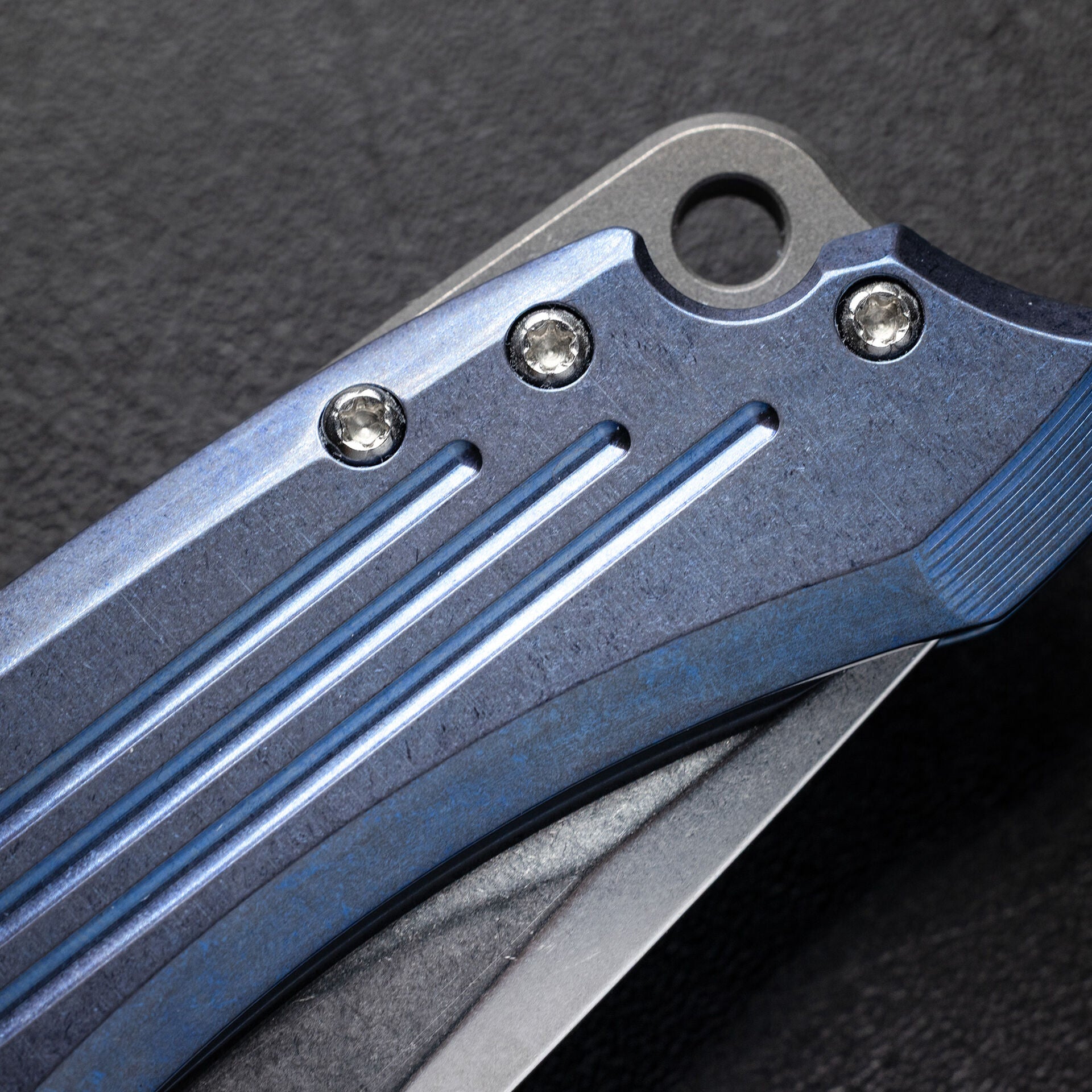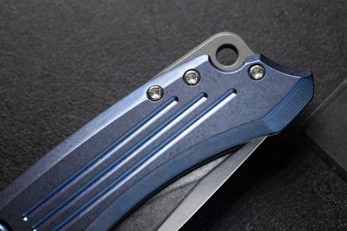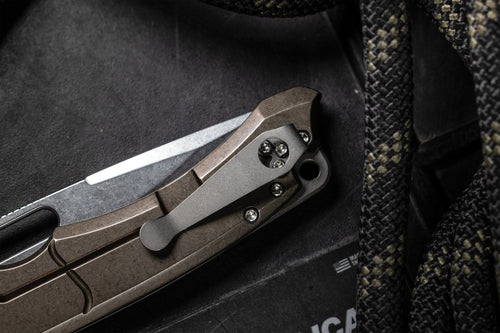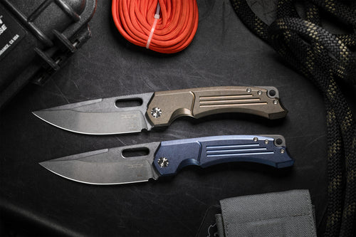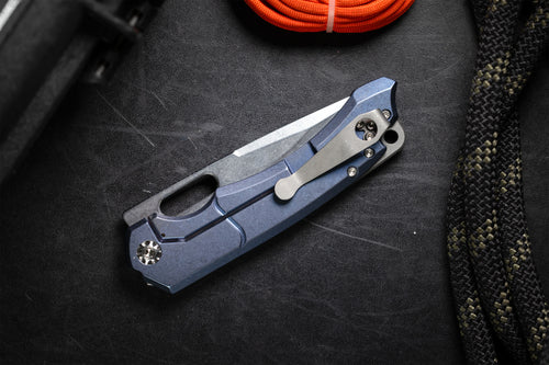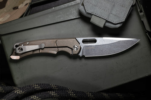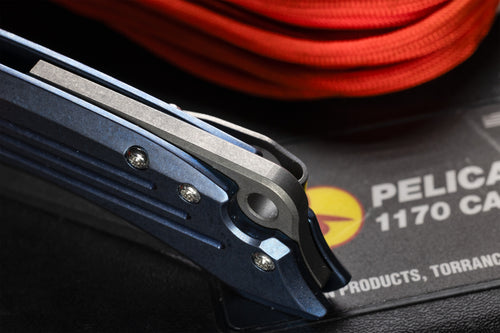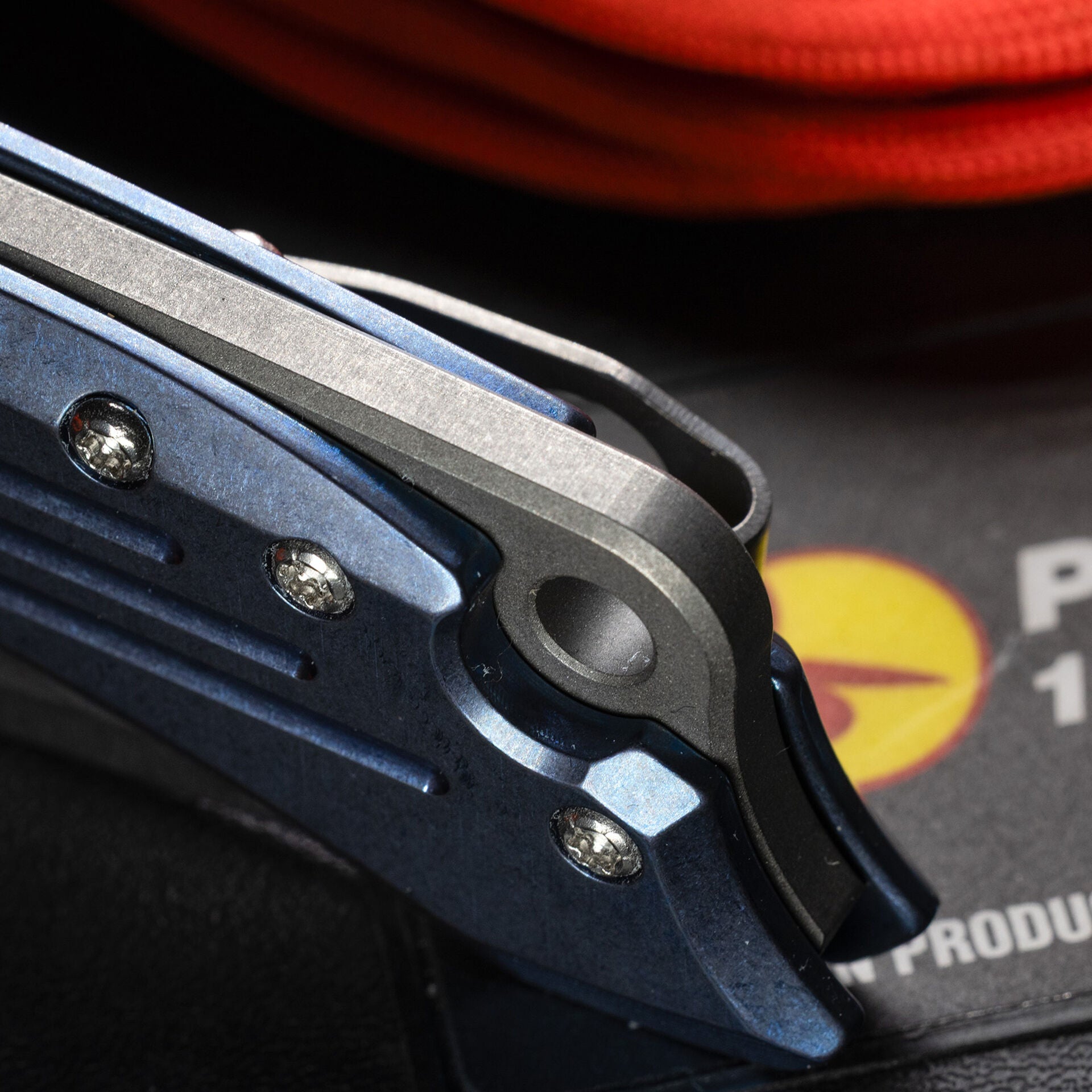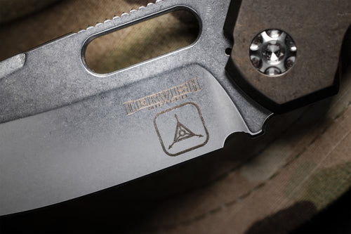 The heavily contoured slabs of this titanium framelock feature our triple fuller and anodized finish. A drop point Magnacut blade balances a deep enough belly for slicing and terminates in a point acute enough for effortless piercing. Deep aggressive jimping on the spine and expert contoured slabs keep your hand locked in place, regardless of the task at hand. An oversized thumb cutout paired with Skiff bearings assures swift and positive deployment and the hardened steel inserts promise years of hard use. The titanium frame lock assures the blade stays locked in place until the task is done. Finishing touches include a heavily jimped titanium backspacer, custom titanium pivot, and a Lynch Northwest clip. Dervish and TAD logos are at the base of the blade.