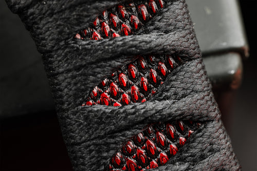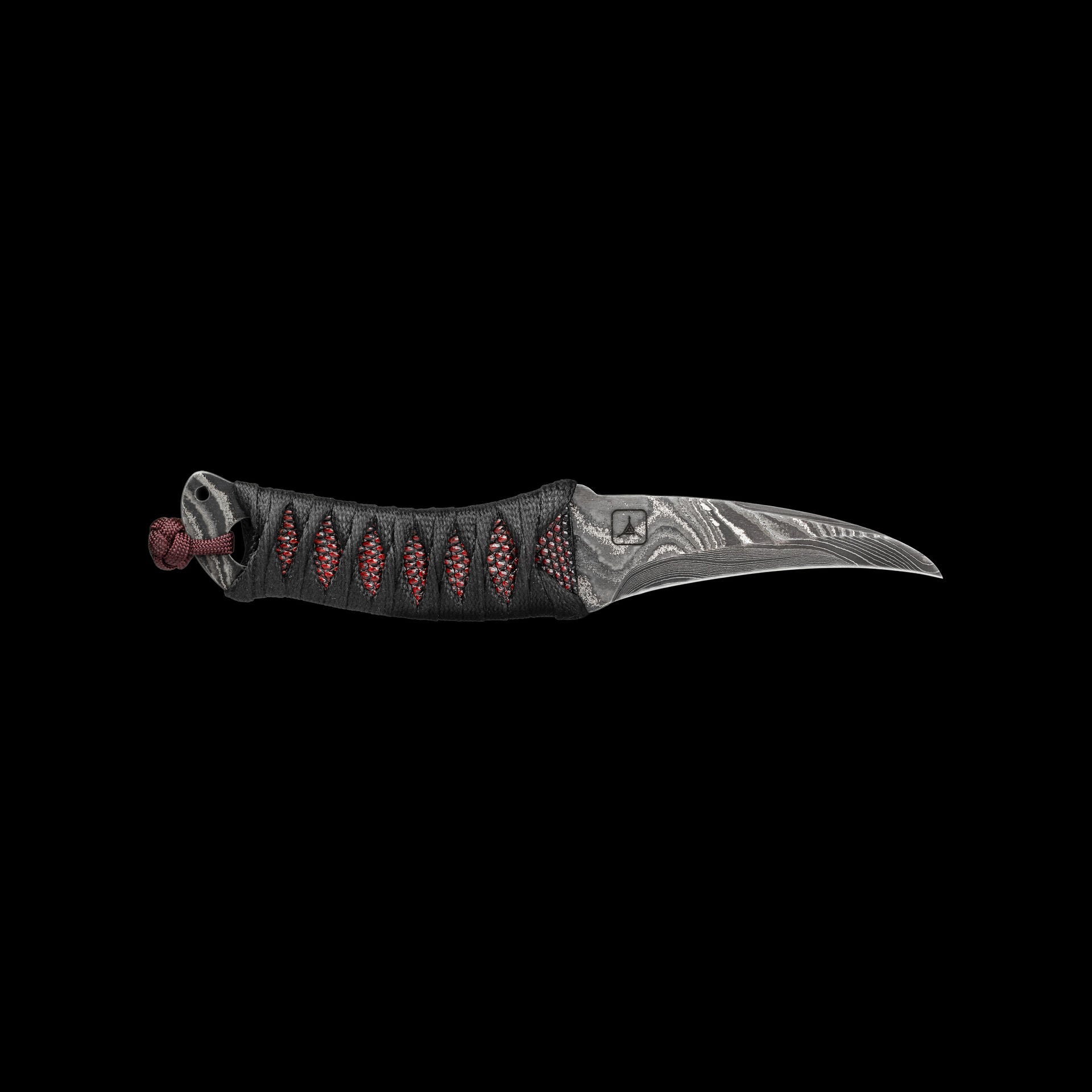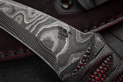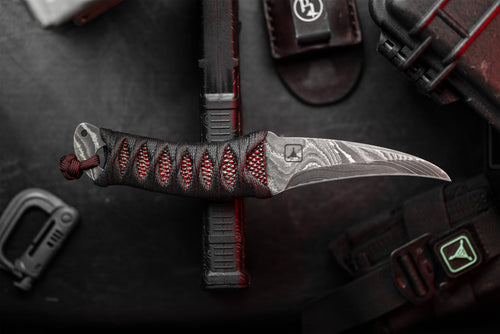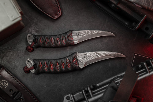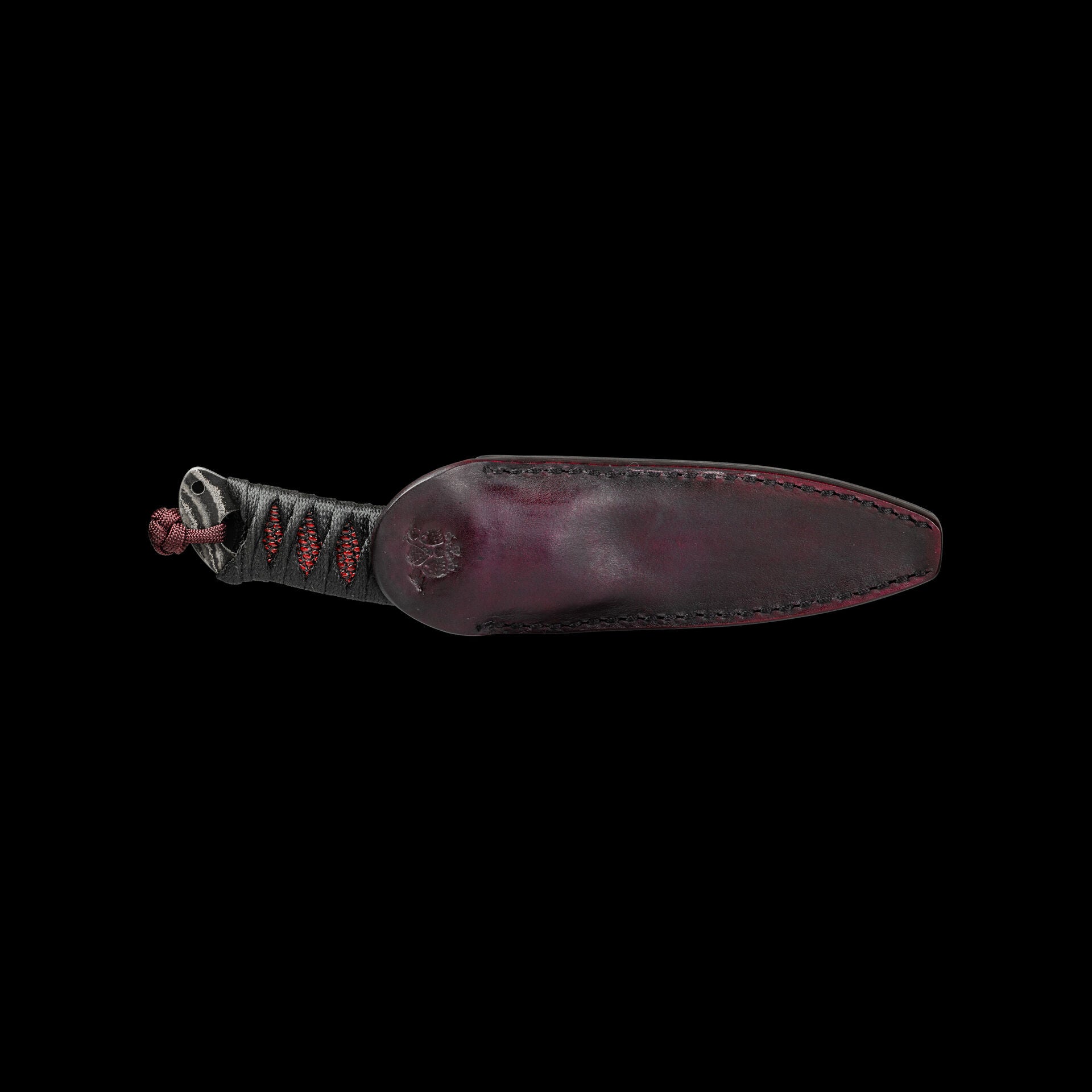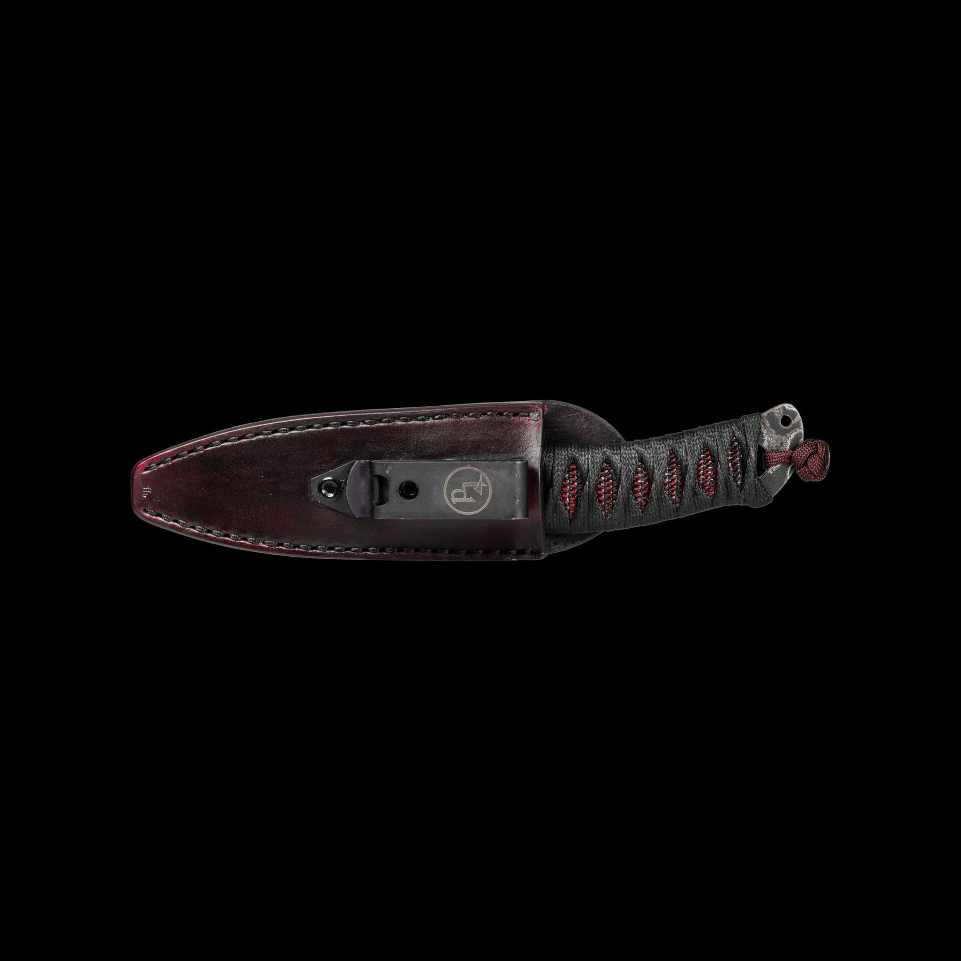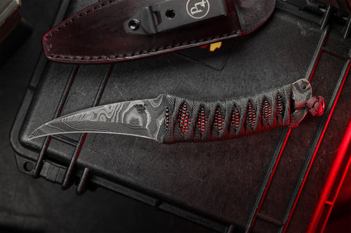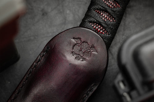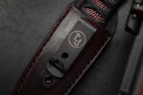 The reversed edge, matched to a full sized secure handle, make for a powerful emergency cutting tool. The black Japanese style wrap has an Oxblood Iguana under layer, creating an aggressive grip to lock onto your hand. The wrap is coated in Marine epoxy and combined with the contours of the handle, this knife is secure under any circumstance. Earls Customs XL La Rona is small enough to disappear in your daily carry but strong enough to serve when called into action. The sheath is just as well executed for its purpose. The custom ambidextrous sheath is a deep carry design. Handmade from leather in an exclusive OxBlood color with hand stitched nickel wire and Tracker Dan clip. Made by @JeyrHooligan.
