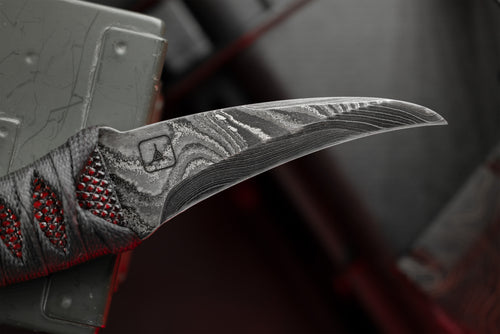 Earl Customs' XL La Rona model comes in dramatic Alabama Thunder Forge Damascus.This reversed edge knife design is based on years of research and consulting professionals in the personal protection field.