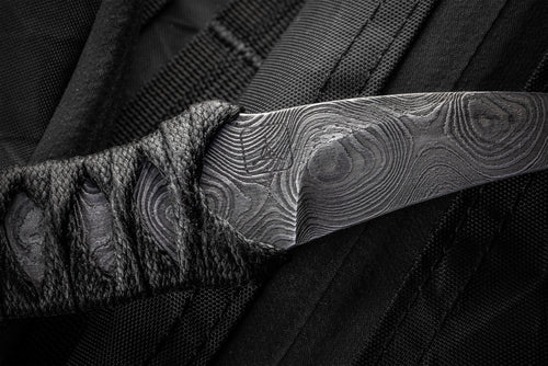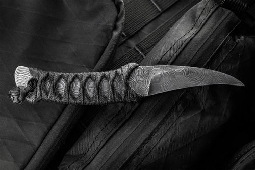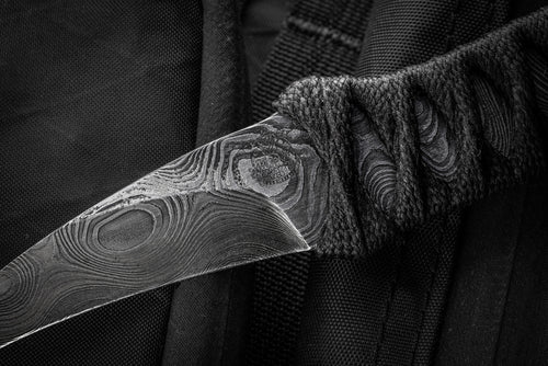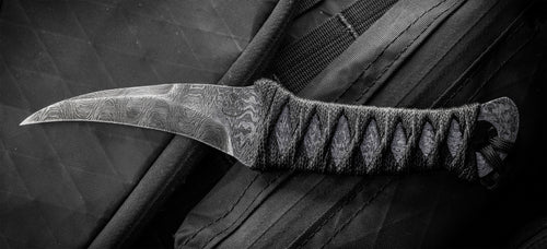 Our first offering from Earl Customs is his La Rona model in dramatic Alabama Thunder Forge Damascus.This reversed edge knife design is based on years of research and consulting professionals in the personal protection field.