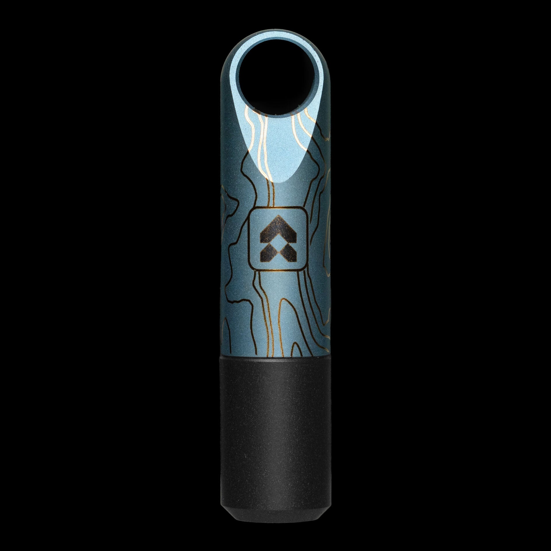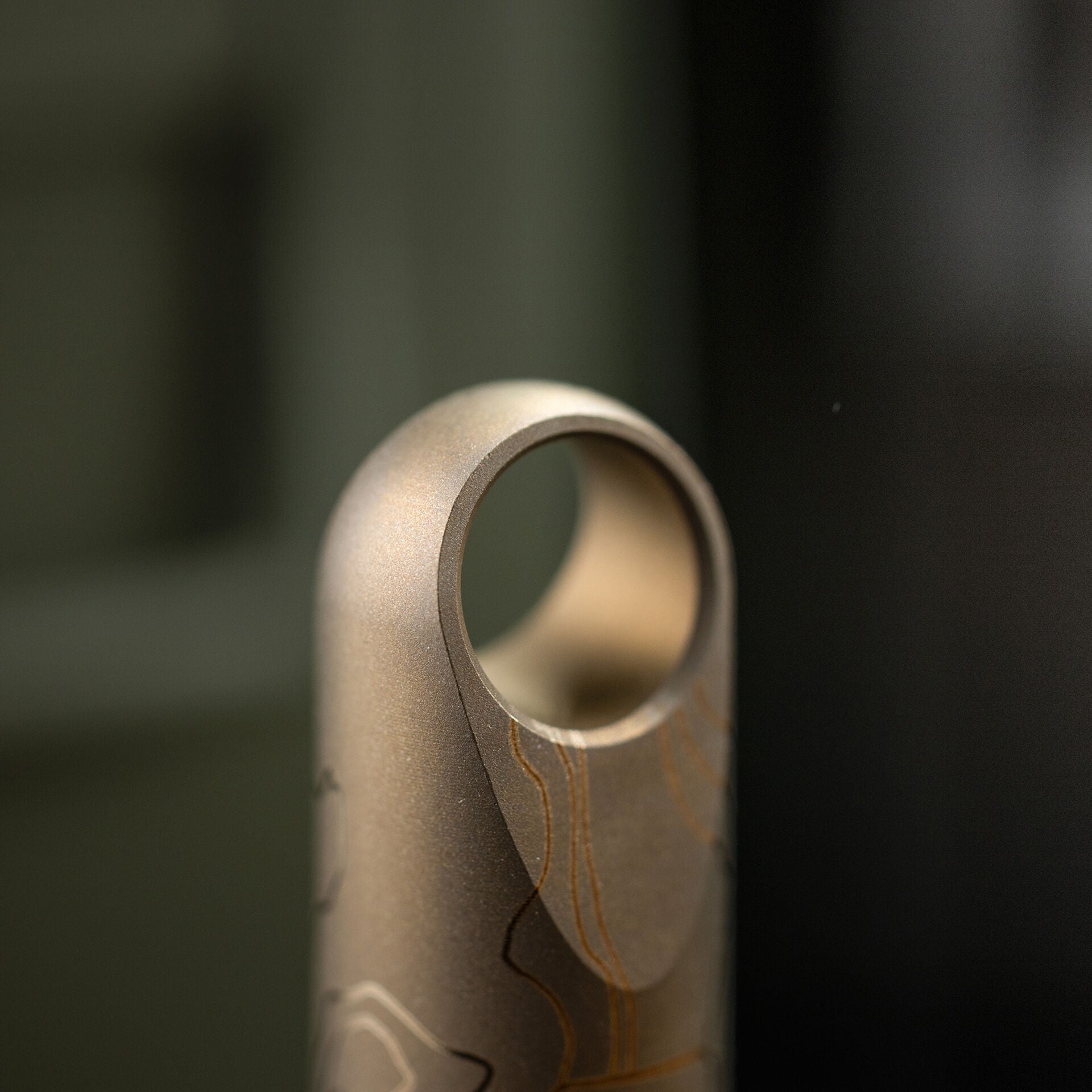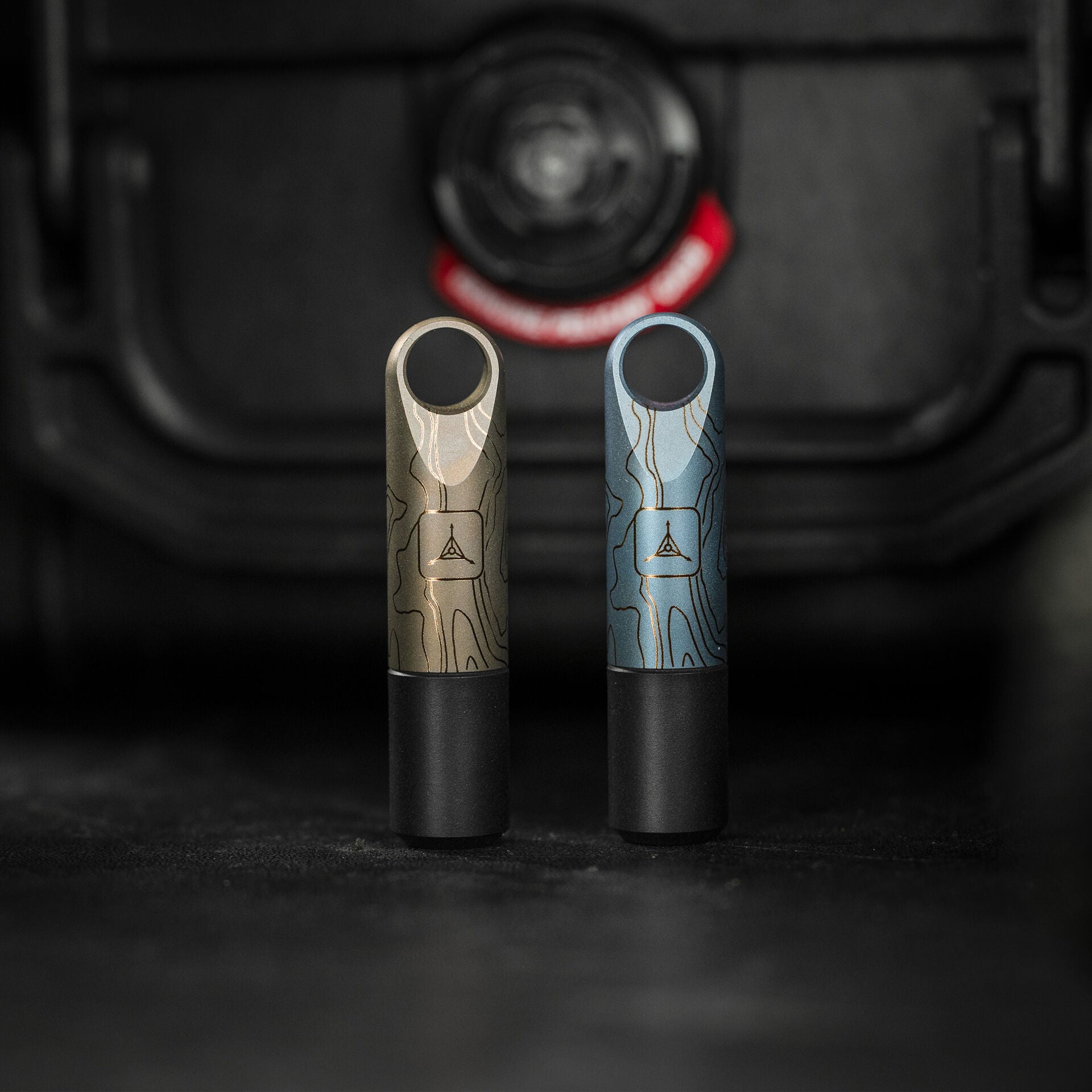 The Fairing Topo Mini Stash is a convenient way to keep some emergency cash or medication on hand. The small size is just the right dimensions to hold one folded U.S. bill or anything small and important you want to carry every day. The body is made from grade 5 titanium with a Delrin cap. This anodized edition comes in either a deep blue or bronze, offering sharp contrast to our signature topo pattern.
