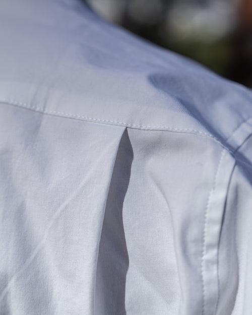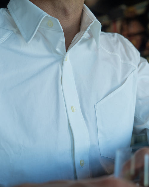 A single patch pocket on the left chest adds functional capability and visual distinction. Its angled top edge introduces an architectural element that complements the shirt’s refined structure—purposeful in use, confident in form.
