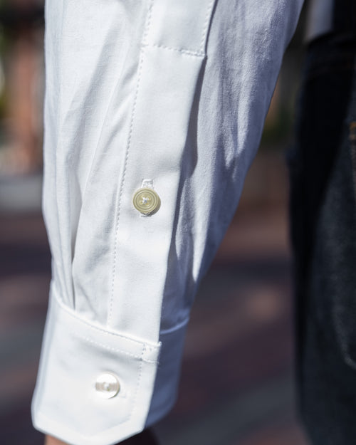 Cut and sewn in the USA, Gambit’s tailored patterning is built for composure and mobility. A discreet action-back design expands as you move, delivering freedom of motion beneath a composed exterior. A gusseted side seam and slightly extended hem maintain coverage and range, working cleanly whether tucked or untucked. Reinforced stitching, balanced proportions, and traditional four-hole buttons reflect a quiet commitment to craft.