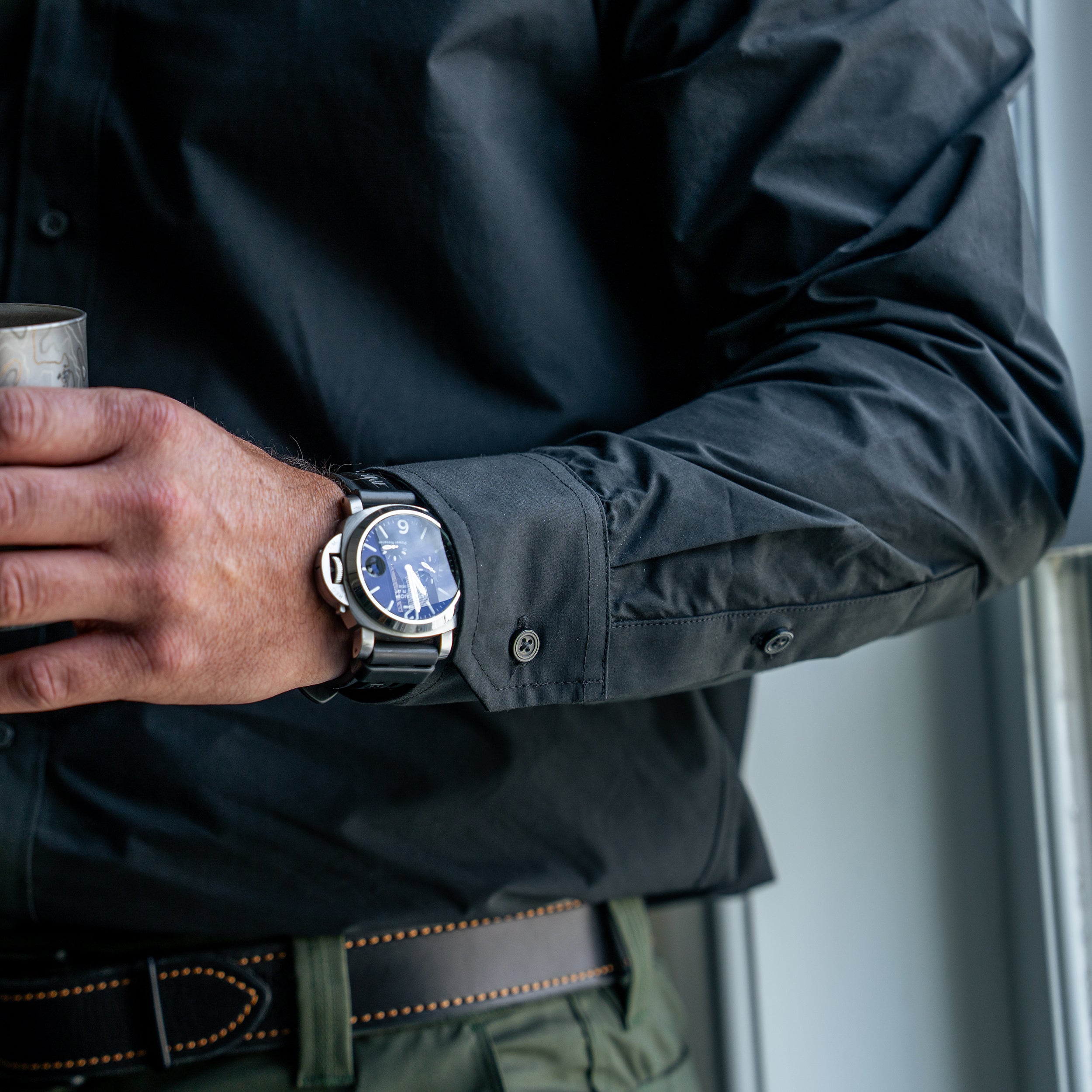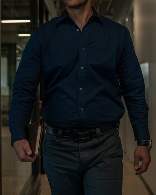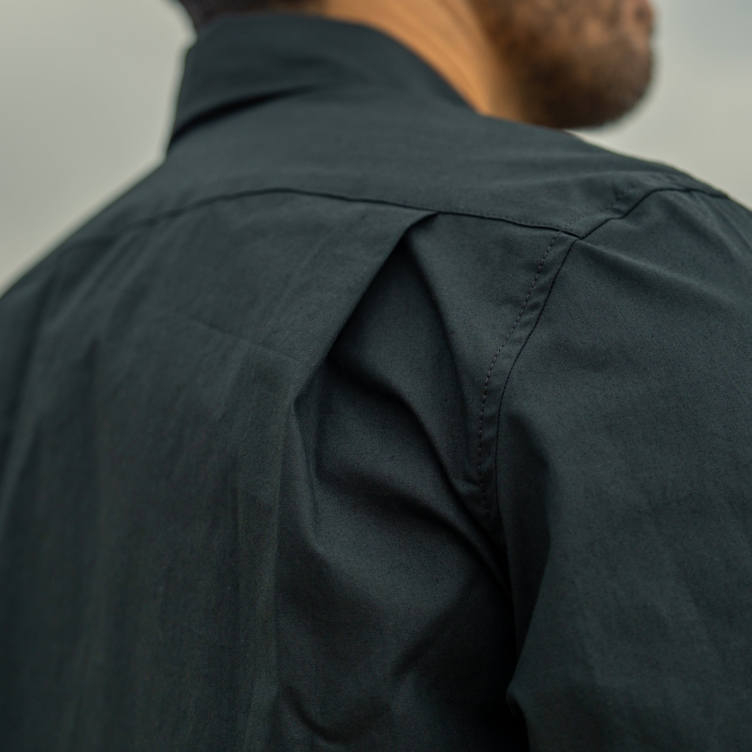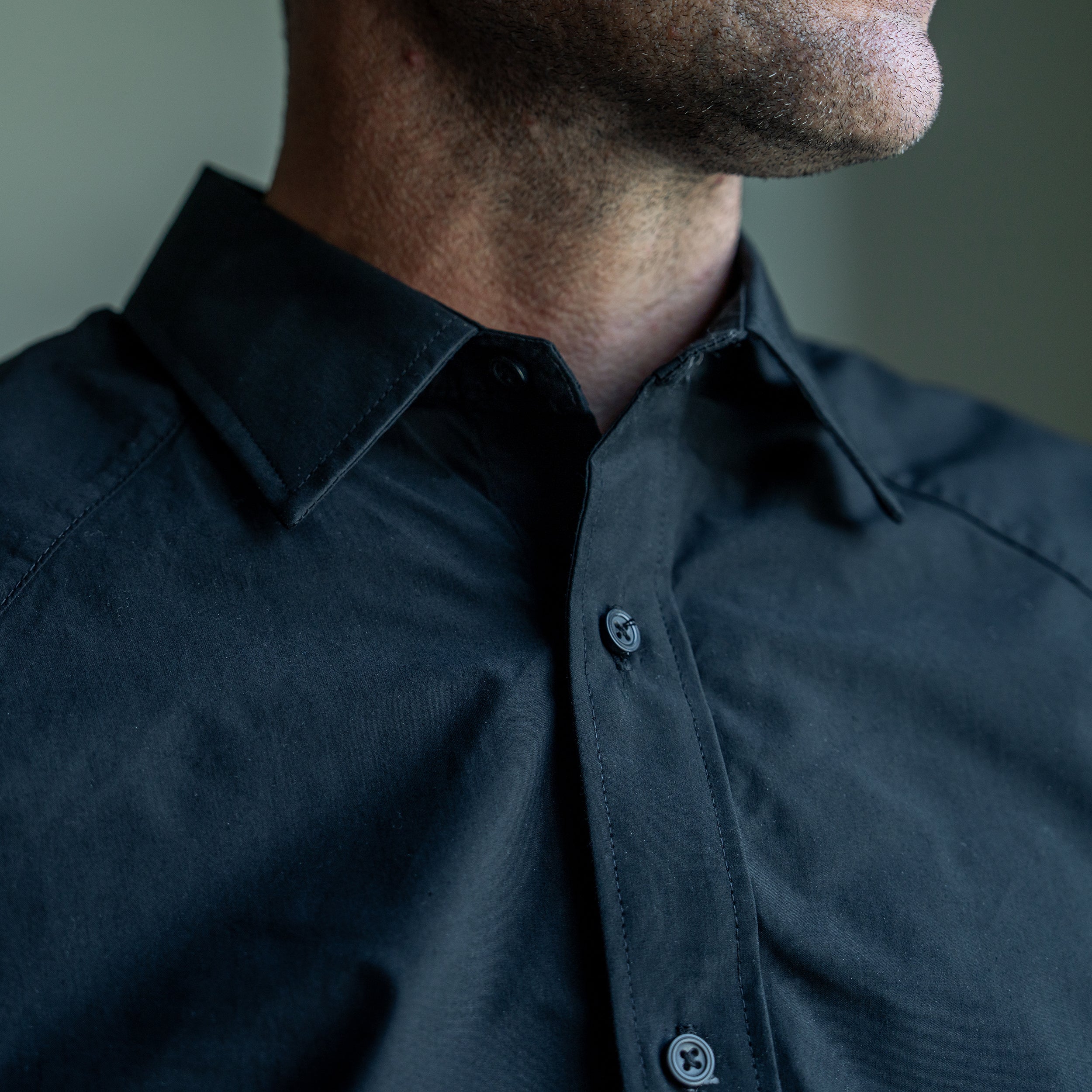 Gambit's gusseted side-seam construction adds mobility and elegance when worn untucked, and reduces bulk when tucked in. Classic 4-hole pearlescent buttons, ample sleeve plackets that enable clean folds, and strong collar proportions make Gambit adept at blending in across diverse levels of attire.