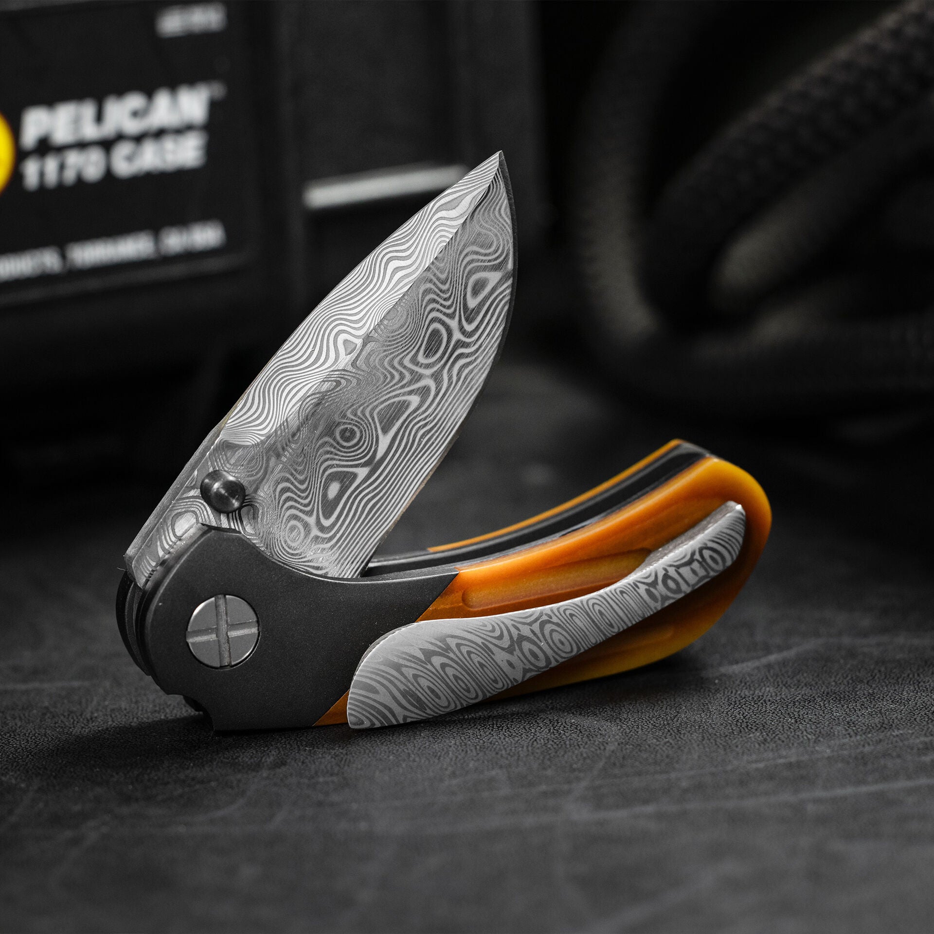 Eminently pocketable at 3.5” closed, the Calypso lives up to its name. Starting with the expertly ground swedged drop point, the 2.5” blade is made from striking Damasteel. Dual titanium thumb studs deploy the drop point riding on ceramic bearings when opening. The blade is held fast by a ceramic detent when closed.