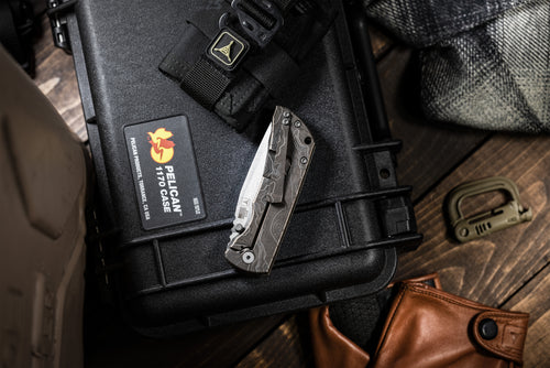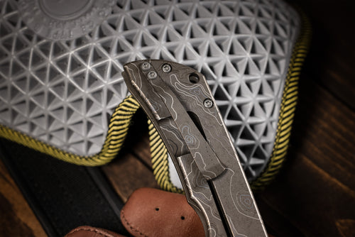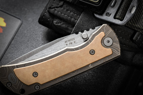 This custom edition of the Mac 2 3.5 G2 features upgrades to both materials and design. Starting with Magnacut blades that Jonathan hand grinds himself, the frames are bronzed, with our topo pattern laser applied. Richlite inserts finish the build on these special editions.