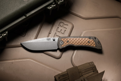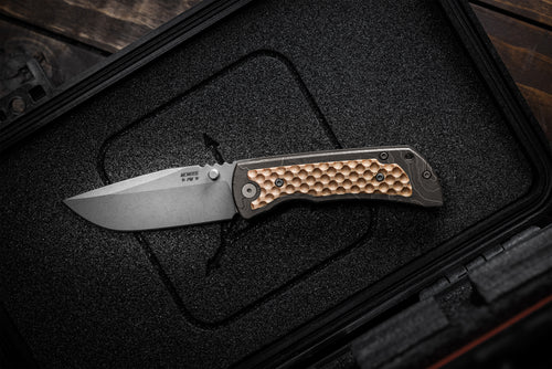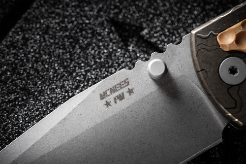 Our TAD Edition comes in a rich bronze with our signature topo pattern laser applied to the frame and clip.The dark tumbled Magnacut blade are machine hollow ground. A RIchlite inlay is set into the presentation side of the handle, while our logo is nested on the blade, mirroring the Mcnees logo.