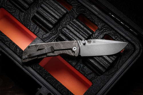 This custom edition of the Mac 2 3.5 G2 features upgrades to both materials and design. Starting with the Magnacut blades, they are machine hollow ground and dark tumbled. The frames are bronzed, with our topo pattern laser applied. Richlite inserts finish the build on these special editions.
