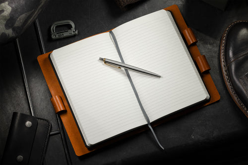 Created around the ubiquitous little black notebook, our cover uses an innovative, in spine binding bar, to allow for any 8.25" by 5" notebook refill. Two stainless steel screws hold the insert firmly in place, but allow for replacement with only a Phillips screwdriver.