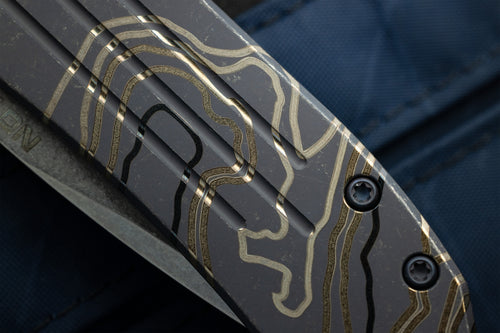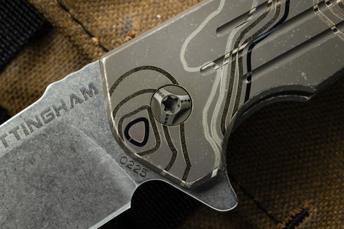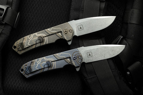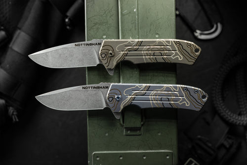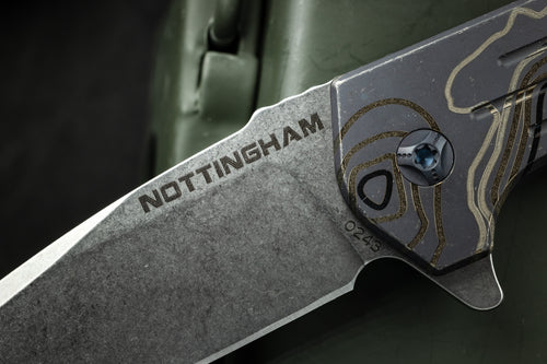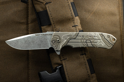 The Ultra4 TAD Edition folder from Nottingham Tactical is made 100% in house at Nottingham's shop. This lightweight flipper has eminently pocketable dimensions to easily include in your EDC loadout. Slim enough to take with you pretty much everywhere, the spearpoint blade profile is thin enough to be a great slicer yet still take on tough work. The blade deploys on a bearing system for a fast and secure lock up. Jimping on the blade for added grip without being overly aggressive. Our Edition features our triple fullers on the presentation side scale with our logo on the base of the blade. Our TAD Edition comes in Stonewash or anodized blue or bronze. Finally, the entire frame and pocket clip have our signature Topo pattern laser engraved.