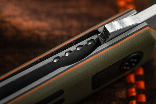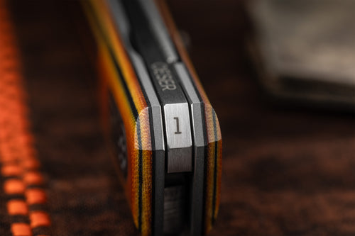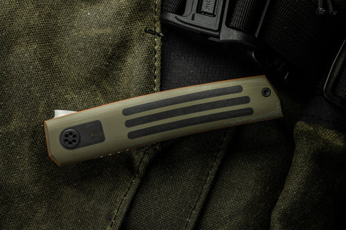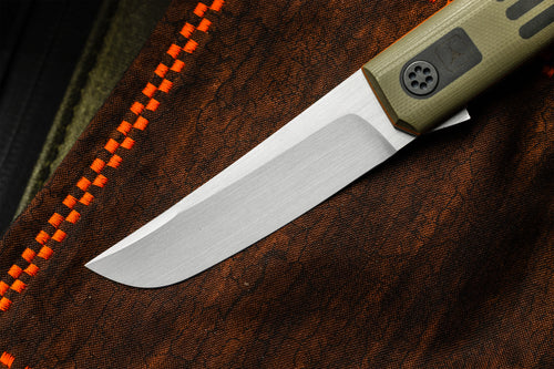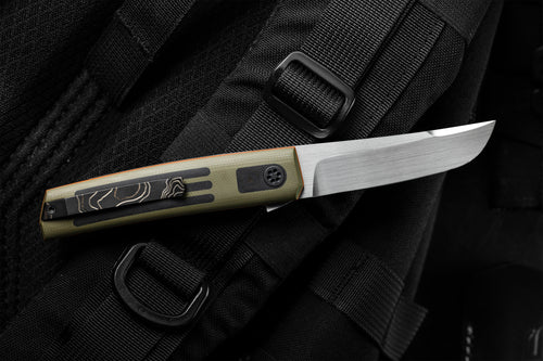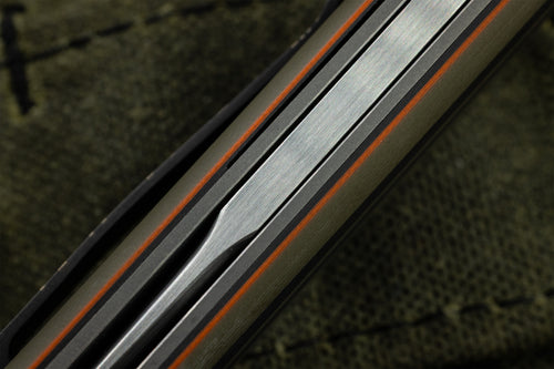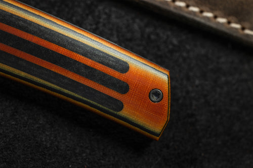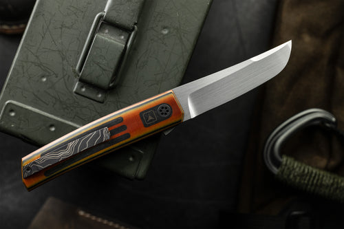Jared Oeser seamlessly blends the best of old and new design cues with exacting tolerances to produce stunning heirloom quality knives. The Tachi is thoroughly modern, but feels like a classic design in hand. Precision tolerances equate to a concert of parts when deploying the flipper of this exclusive hand rubbed modified Tanto blade. Made from AEB-L steel, it rides on ceramic bearings when opening and is held fast by a ceramic detent when closed.