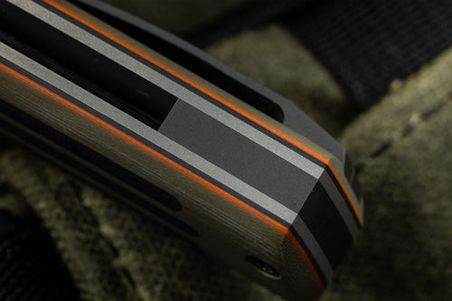 OD Green Micarta with red and black liner overlays with our triple fullers filled with black Richlite.