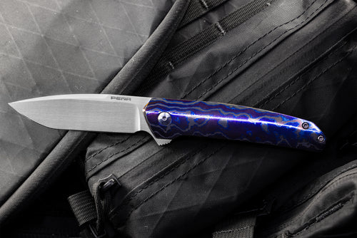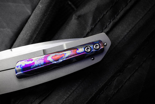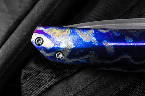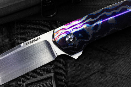The Cobra is a perfectly sized EDC folder. With Enrique’s attention to fit and finish, it makes carry and deployment effortless. This Cobra features a flipper design in lieu of thumb studs. The tang of the blade has fine machined grooves for traction. The handle assembly has a polished Dark Timascus presentation scale and a blasted titanium lockside. The Cobra has a classic drop point blade profile flawlessly ground in hand rubbed CPM154 . The modern elements of a ceramic bearing flipper nest the blade perfectly in the framelock lock handle when closed. Deployment is effortless from the flipper, followed by a smooth strong lock up. Premium materials include the Dark Timascus presentation slab as well as the 3D pocket clip. The Peña Custom Cobra is a perfect example of a modern EDC finished with exceptional detail, promising to be admired as much as used.