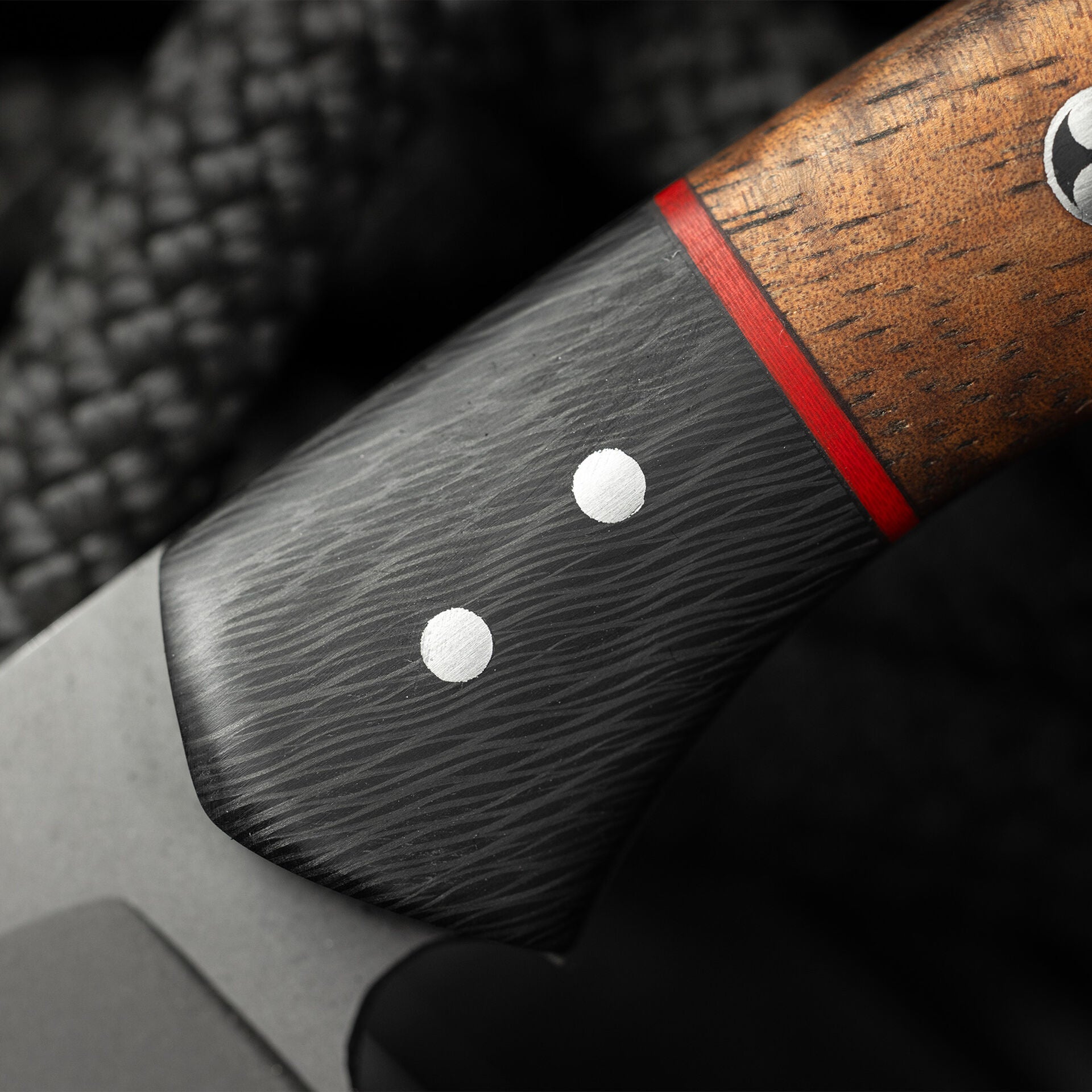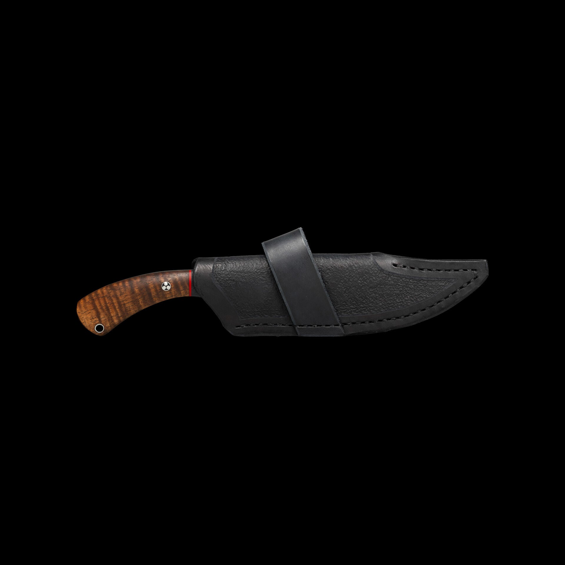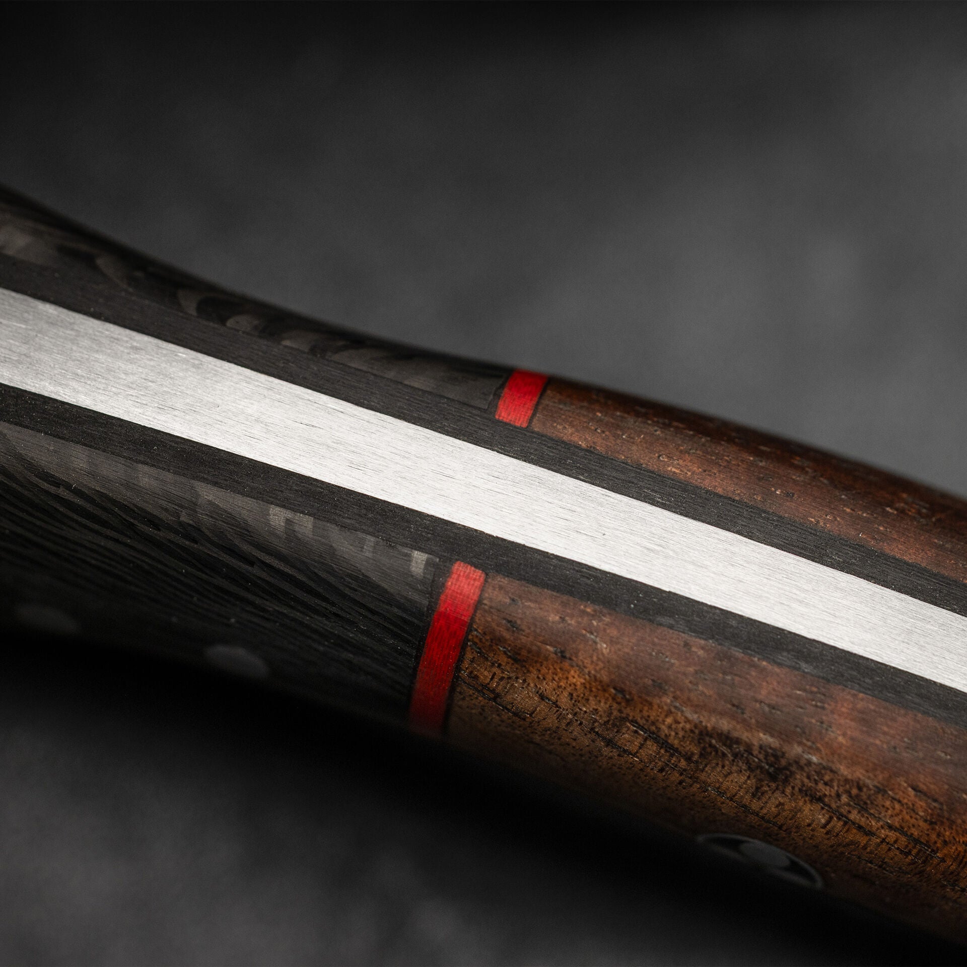 This exclusive model features striking carbon fiber bolster with Hawaiian Koa handles and red G10 liners. The rich tooled leather sheath compliments the knife beautifully.