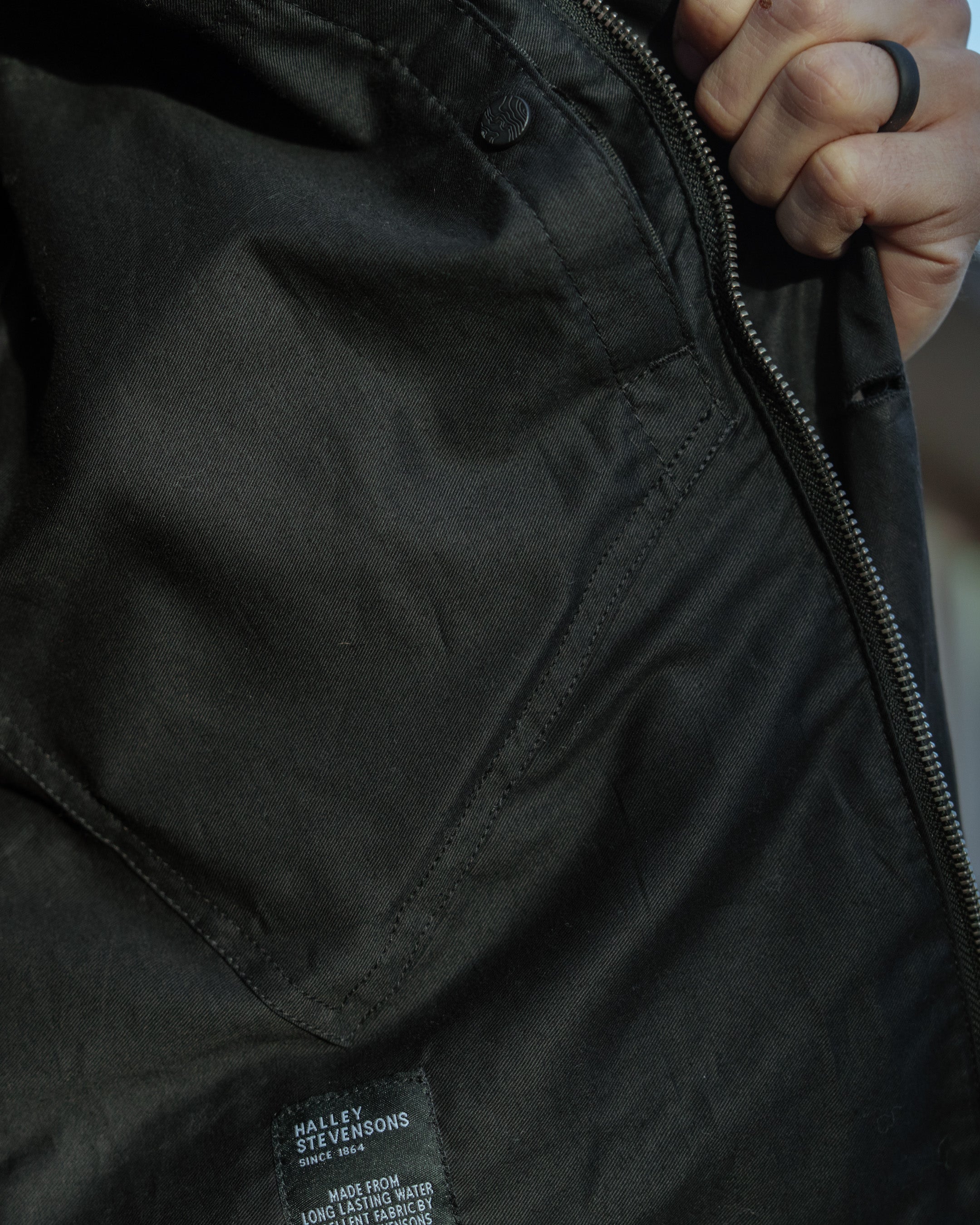 At the heart of the Rake is Hybrid Aero, a lightweight, washable waxed canvas developed exclusively by Halley Stevensons, the Scottish mill that has shaped the world’s benchmark for weatherproof textiles for over 160 years. Combining the mill’s driest wax with a soft tumble finish, Hybrid Aero delivers a clean, matte hand, natural moisture management, and year-round comfort—an evolved alternative to traditional wax fabrics, without compromise.