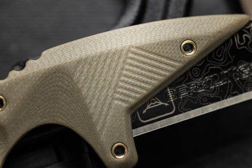 This fixed blade is designed to be a low-profile, yet hardworking tool for light and precise cutting tasks. It features a super-ergonomic, angled handle, CNC-milled from durable G10 composite. The handle mimics the natural grasp of the hand, providing optimal grip, comfort, and control for delicate situations or various tasks like opening boxes and cutting foam board. Despite being as strong as steel, G10 is four times lighter.