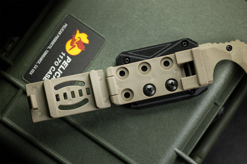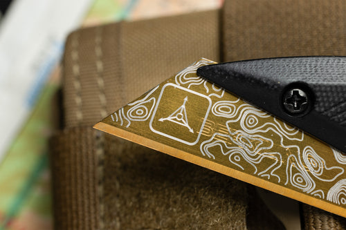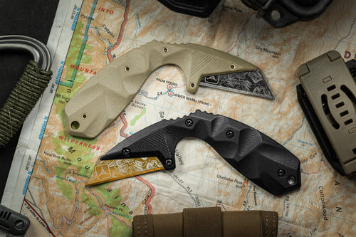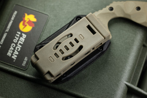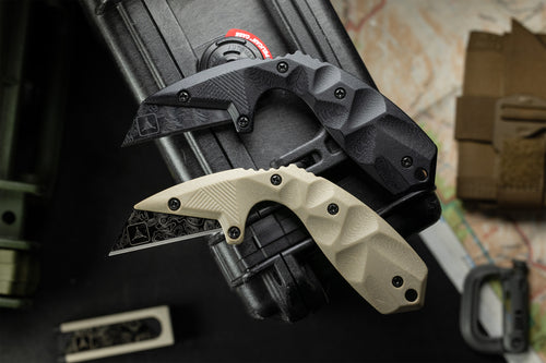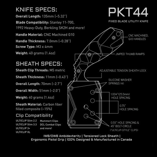 Complementing its portability, the PKT44 includes a durable and lightweight carbon-fiber nylon sheath. This newly upgraded sheath is 40% thinner than previous prototypes and is compatible with various clips (see graph below). Included with this package is the DCL Combat Clip. The ambidextrous sheath features a dynamic tensioning system that applies constant locking pressure without plastic deformation, allowing it to be clipped inside or outside the waistband, or secured to pockets or bag straps. Our TAD Edition comes in either black or tan G10 handle and the following blades: