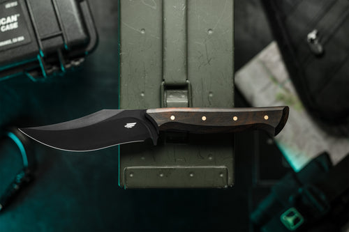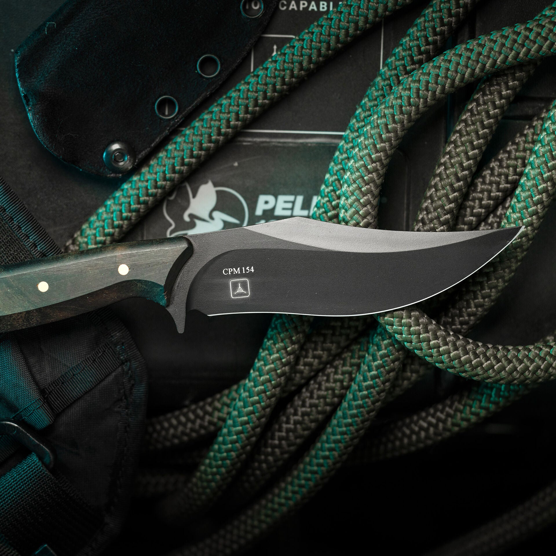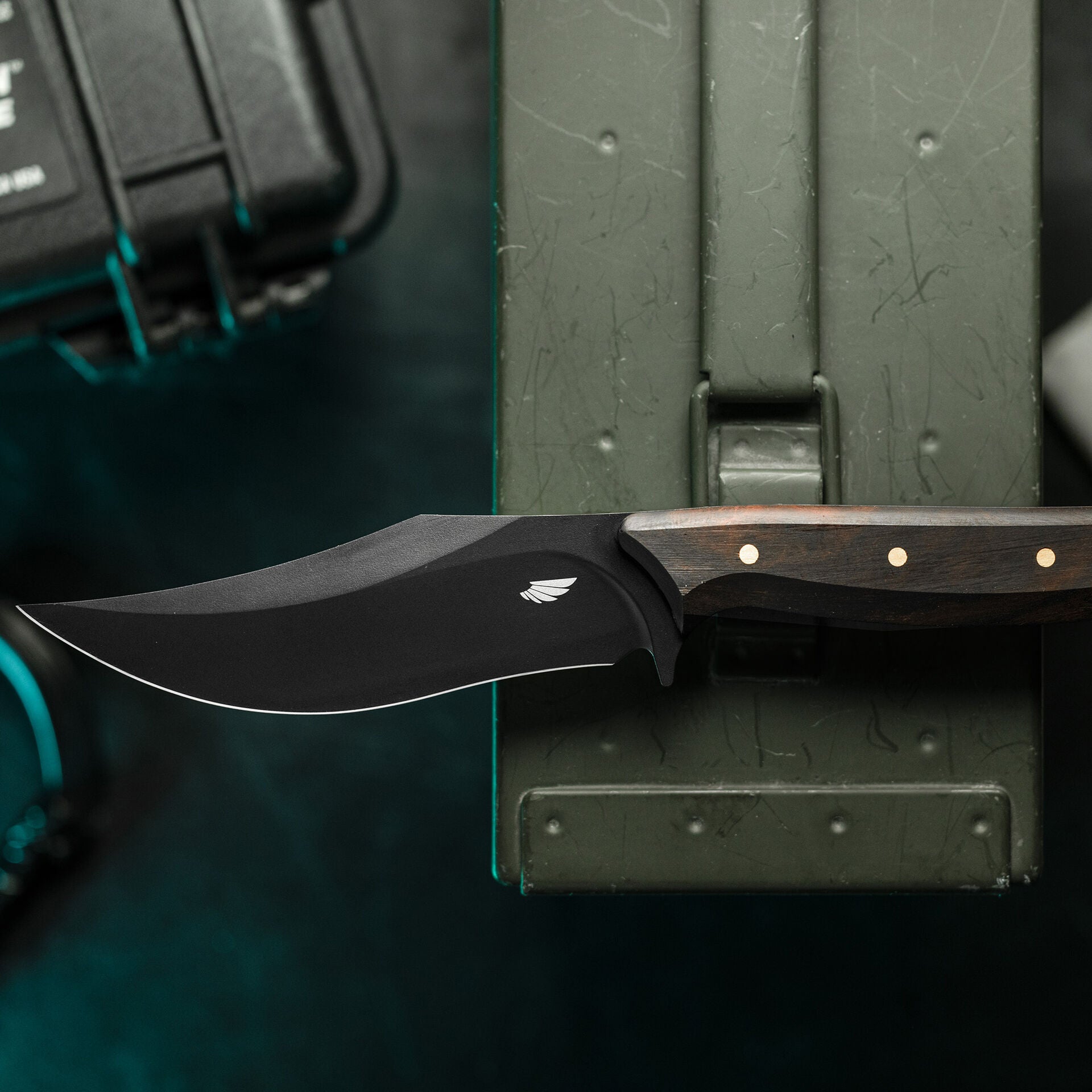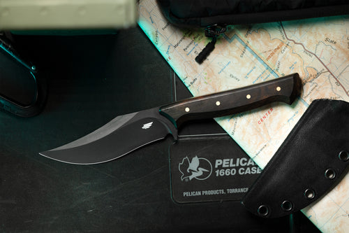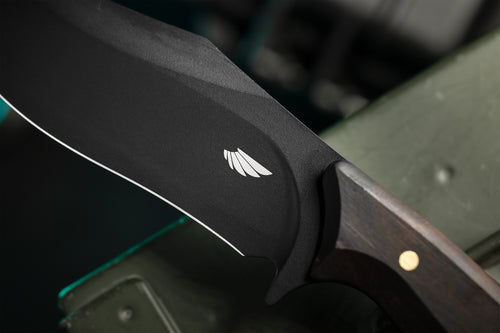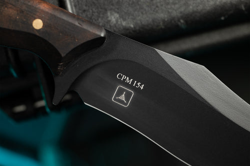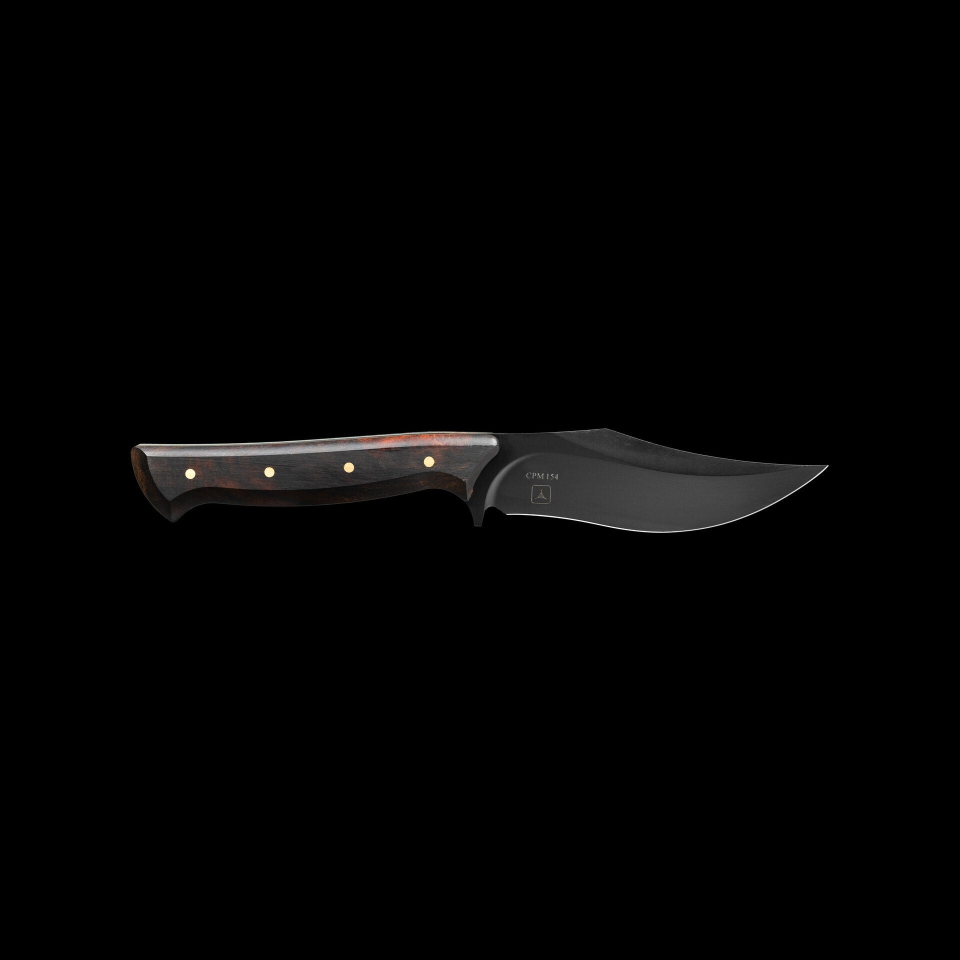 Crafted from CPM 154, a premium American-made stainless steel, the Reign offers an exceptional balance of edge retention, toughness, and corrosion resistance — perfect for hard use in the field without sacrificing sharpness or durability. Each blade is hand-fitted with a striking ironwood handle, known for its natural density and beauty, and secured with four brass pins for a timeless, rock-solid construction. Finished with a rugged black Cerakote coating for added protection and low-glare stealth, each Reign is sharpened to a razor-point edge that’s ready to dominate in both combat and utility roles. This is a knife that doesn’t just carry the legacy of Persian bladesmithing — it commands it.