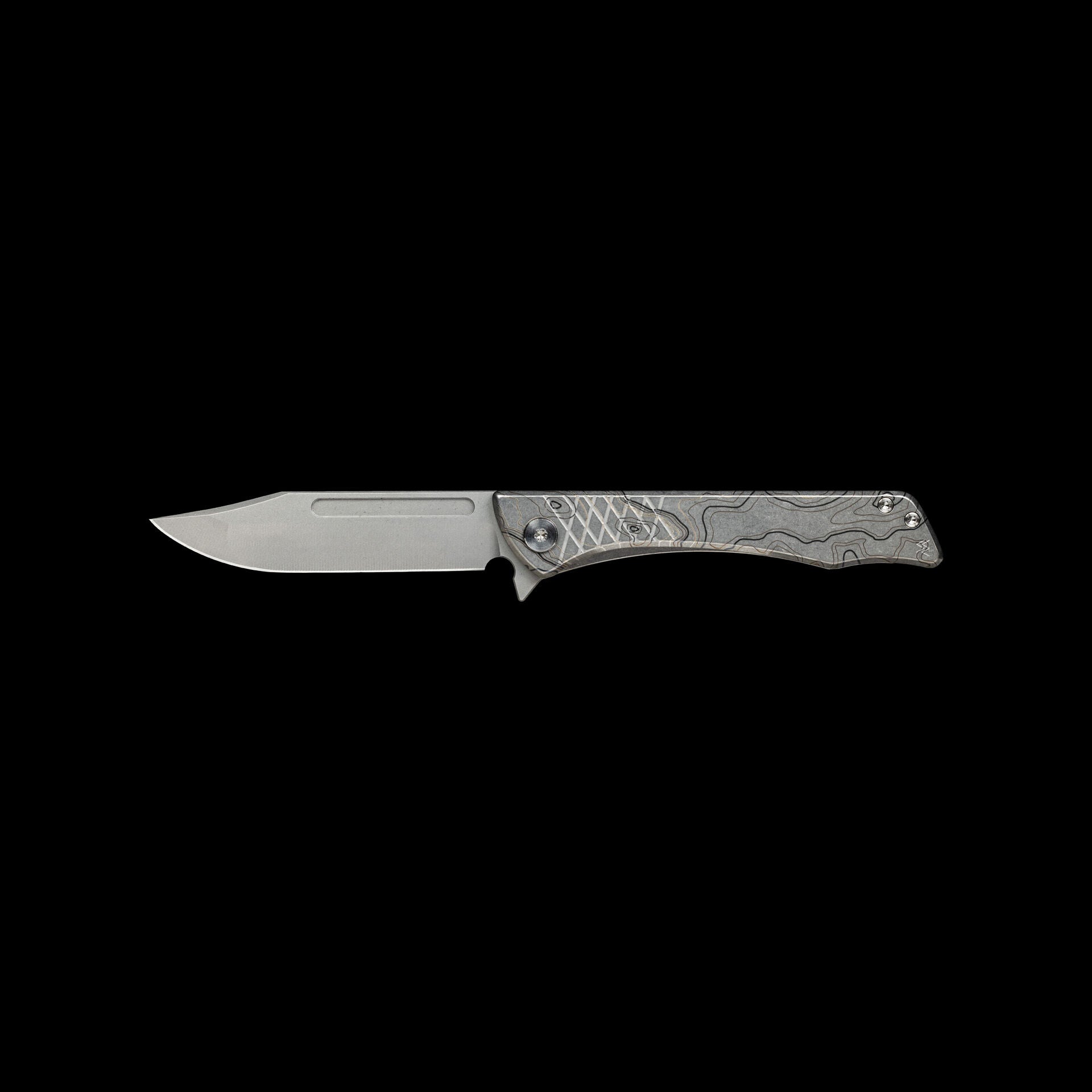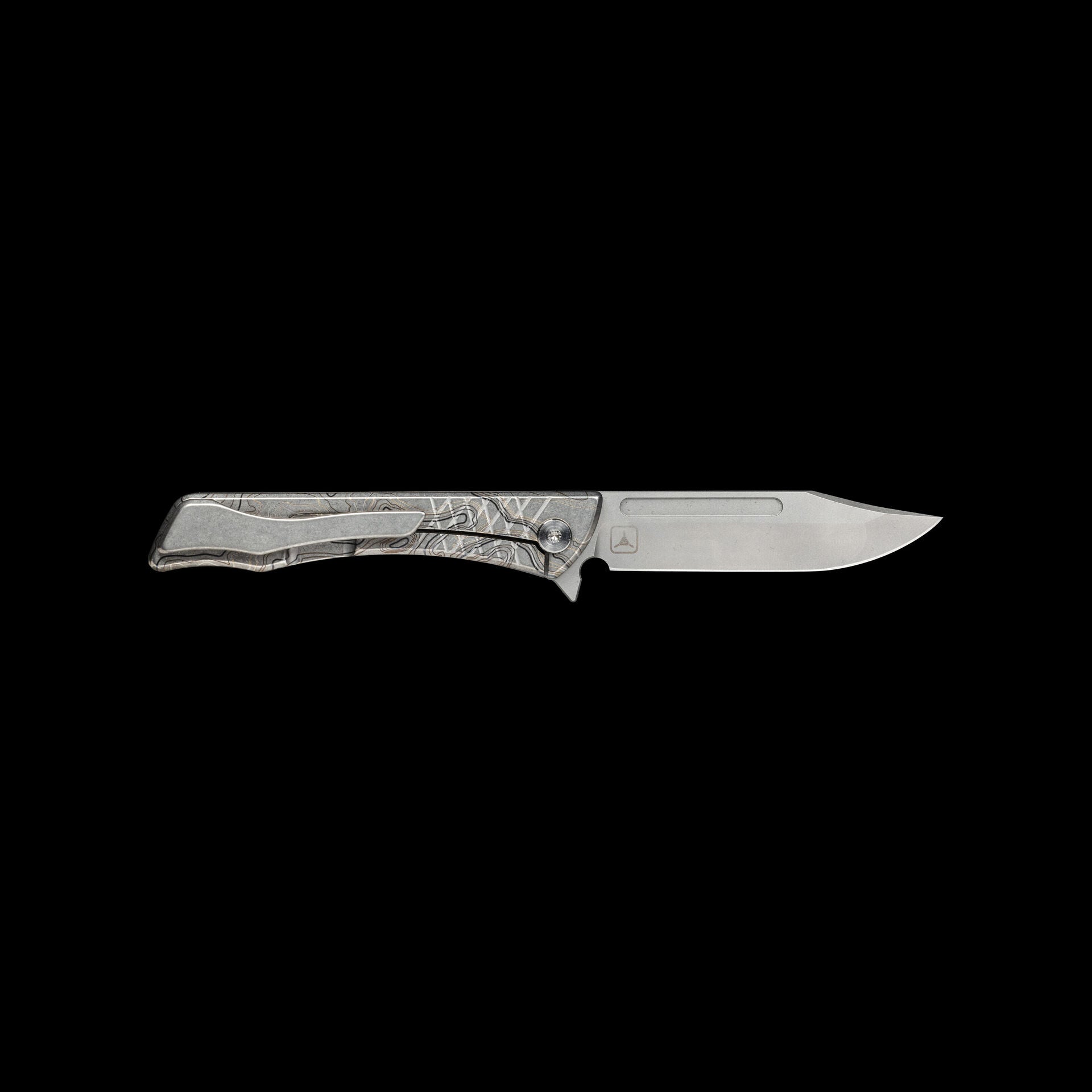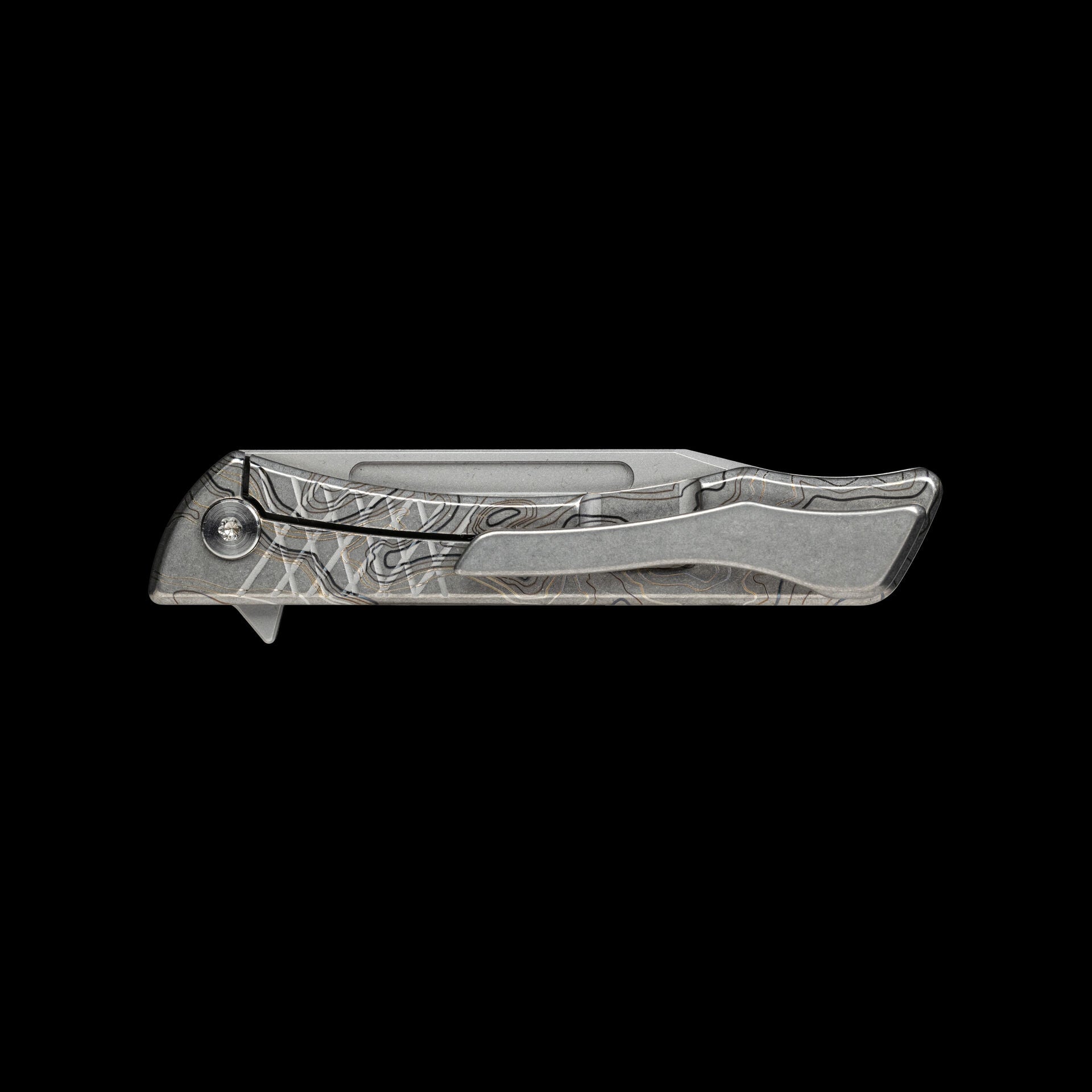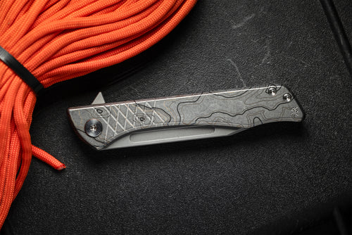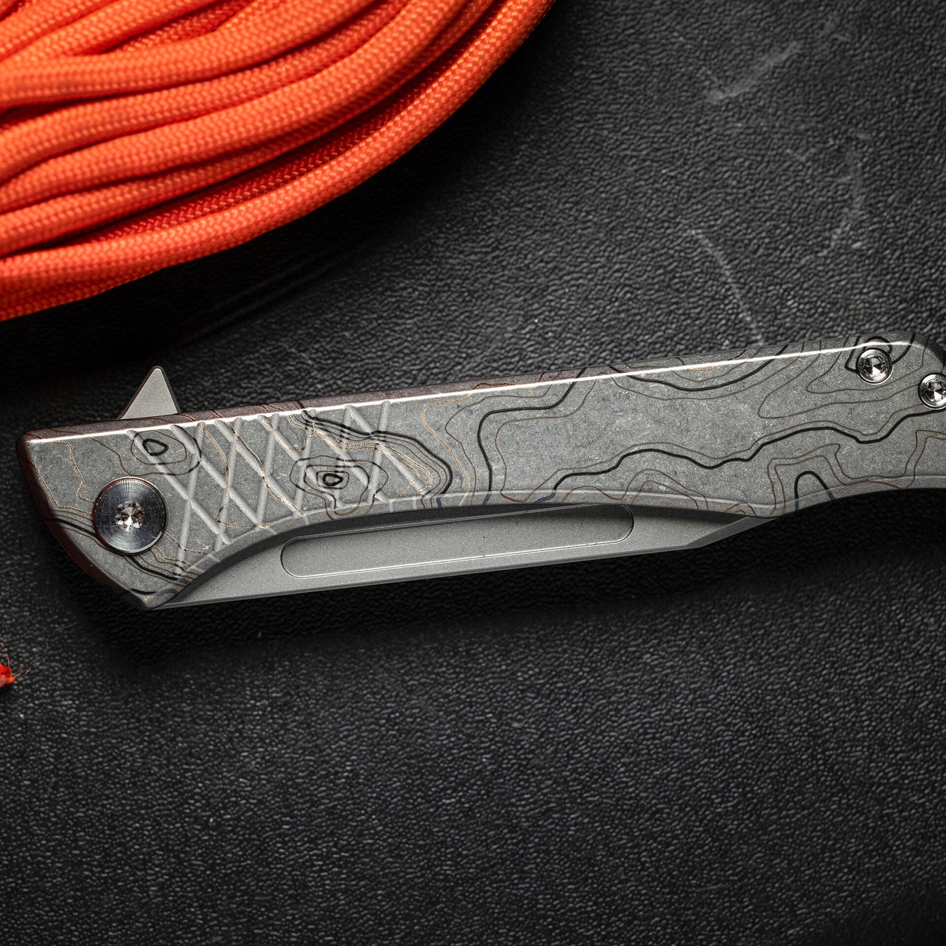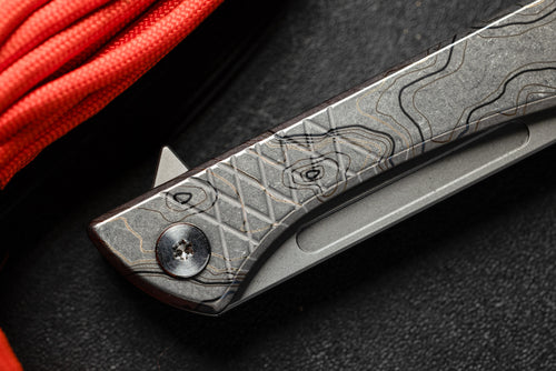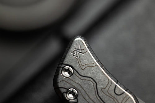 Long thin and lightweight, the titanium handle has a deep front finger groove and handle that widens out to the pocket clip controlling fore and aft movement. The machined titanium pocket clip is attached with blind screws, continuing the clean aesthetic. Finer details include a carbidized lock face for increased wear, and hardened 416 stainless steel pivot for strength. Finally our signature topo pattern and logo are laser applied.