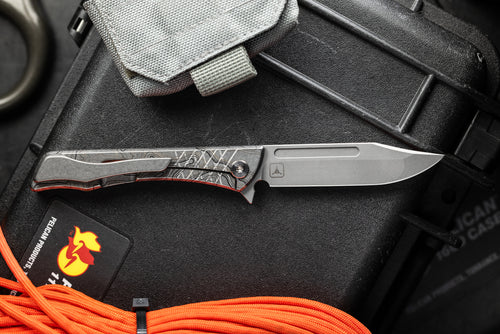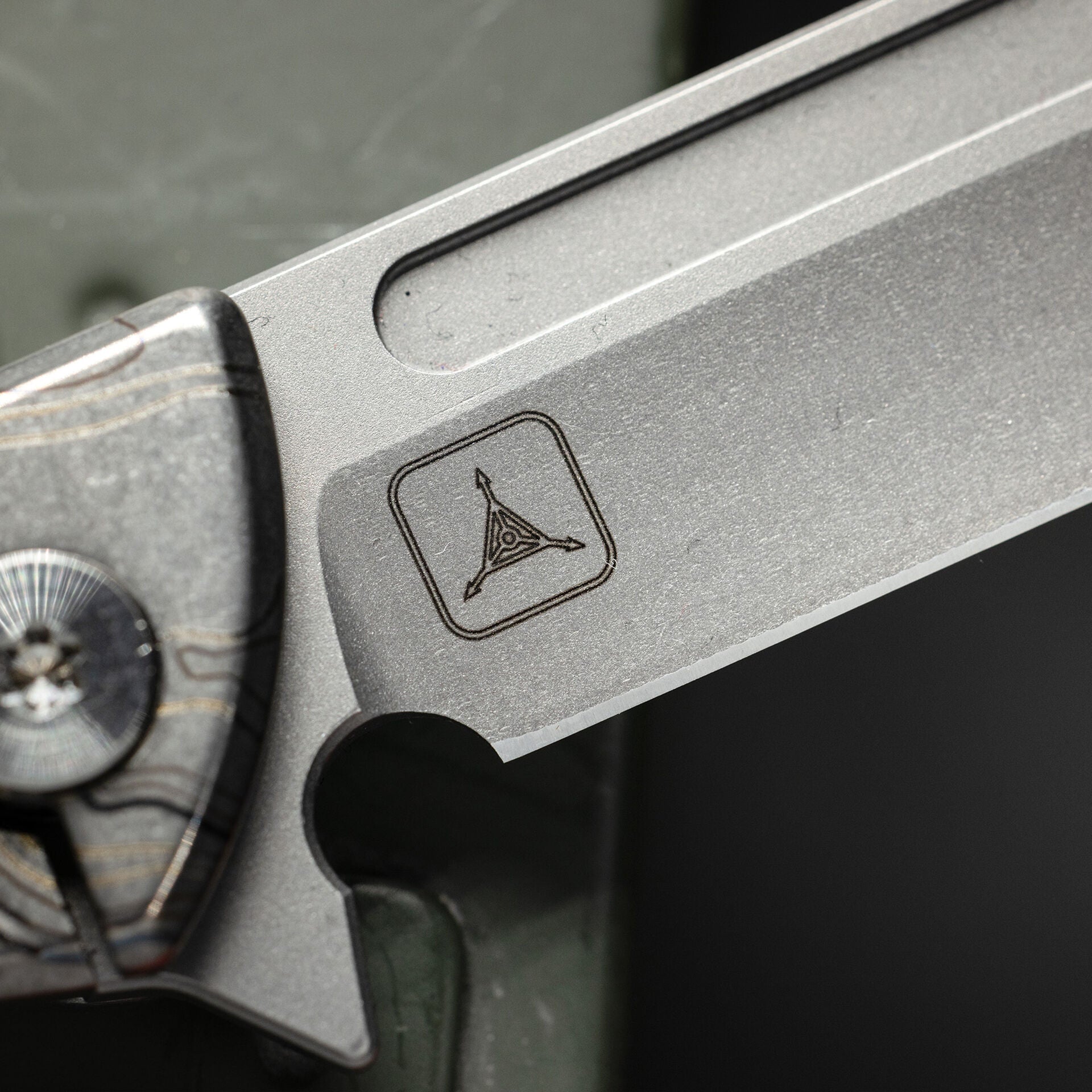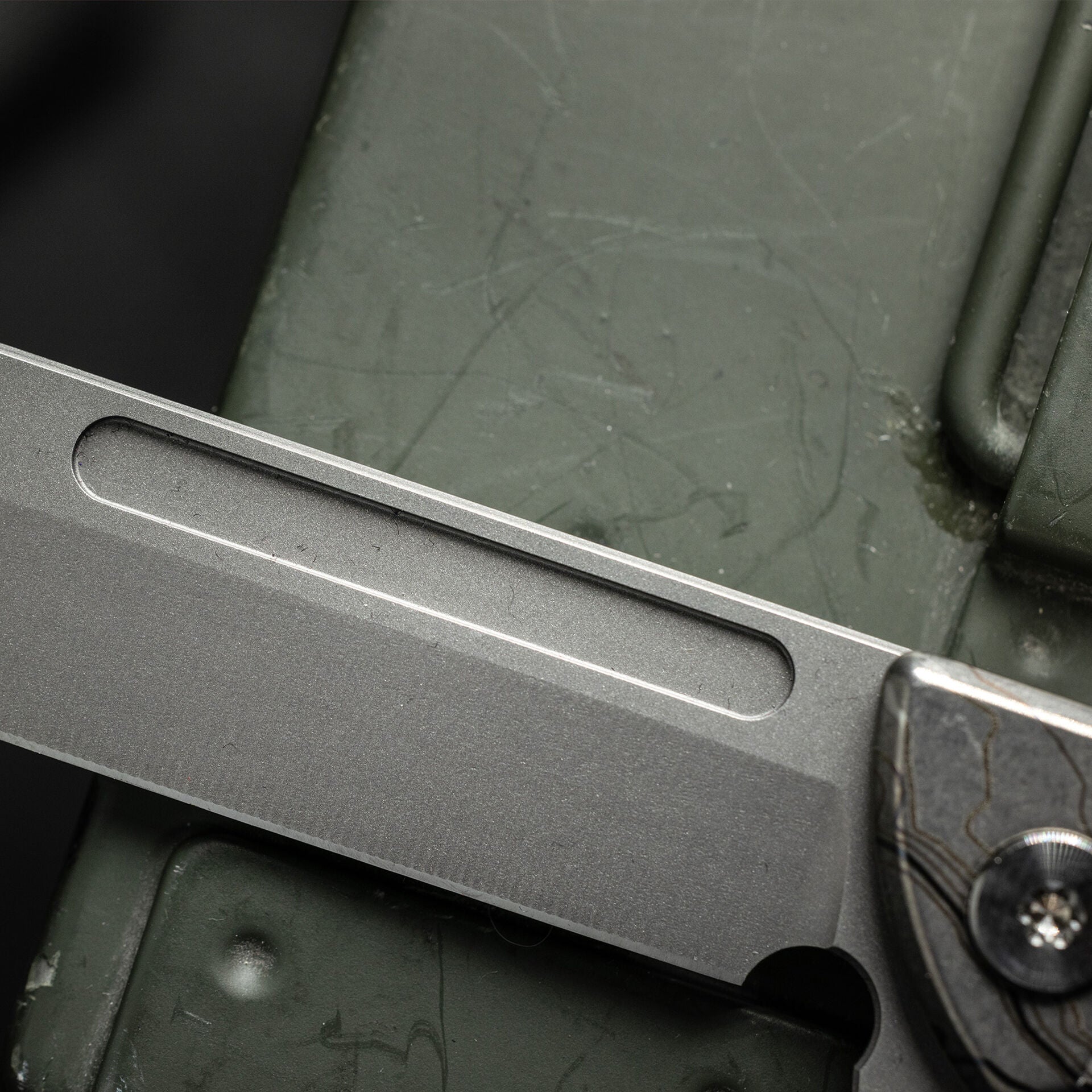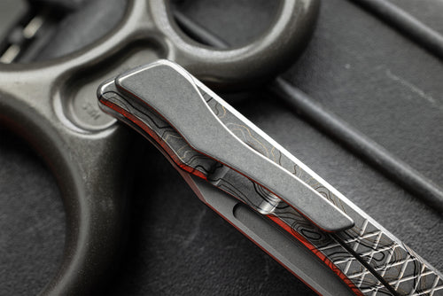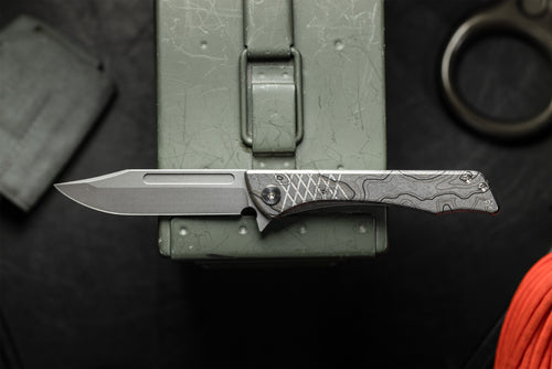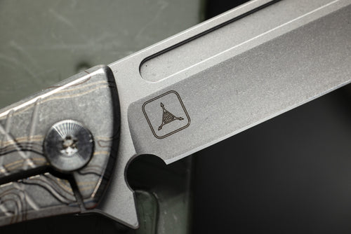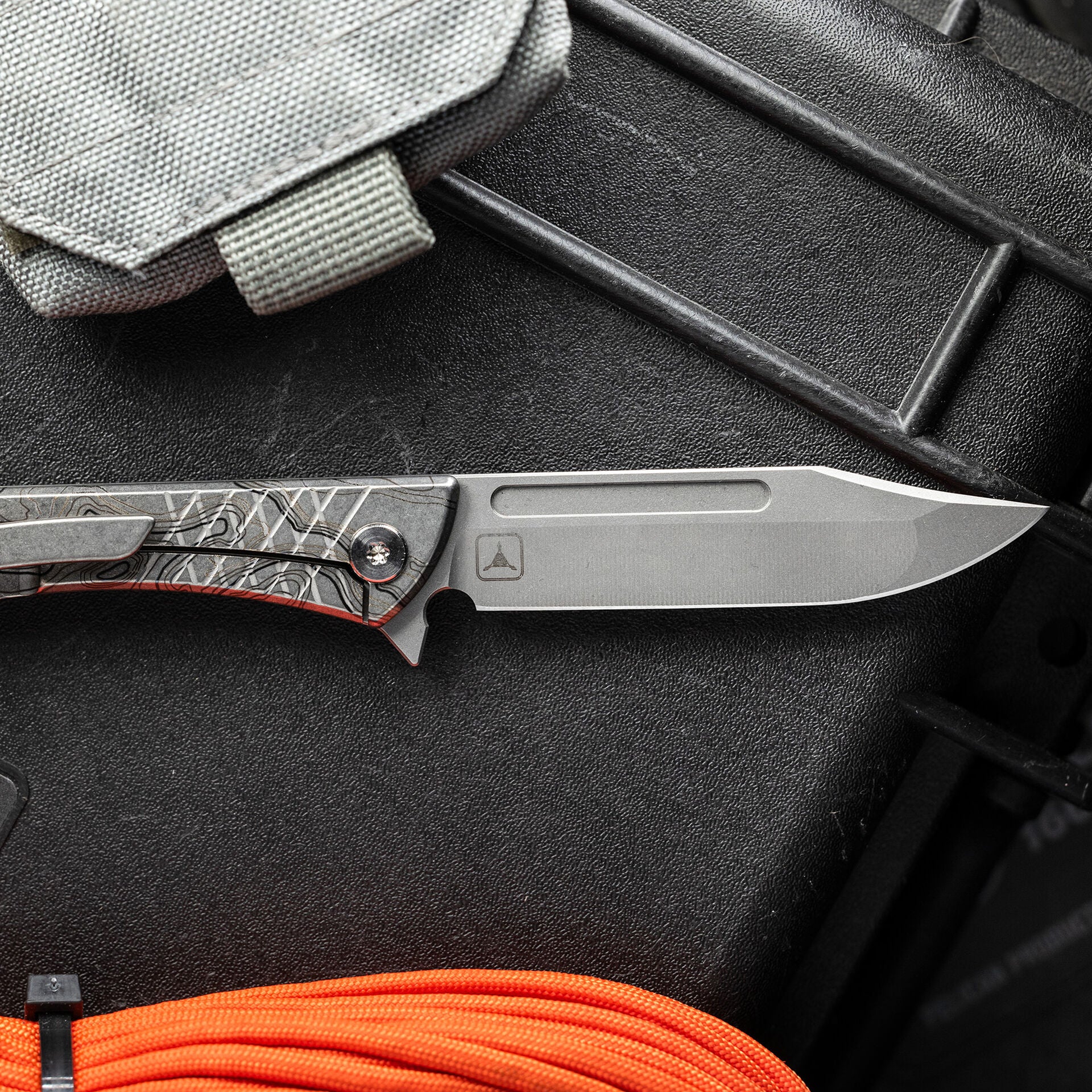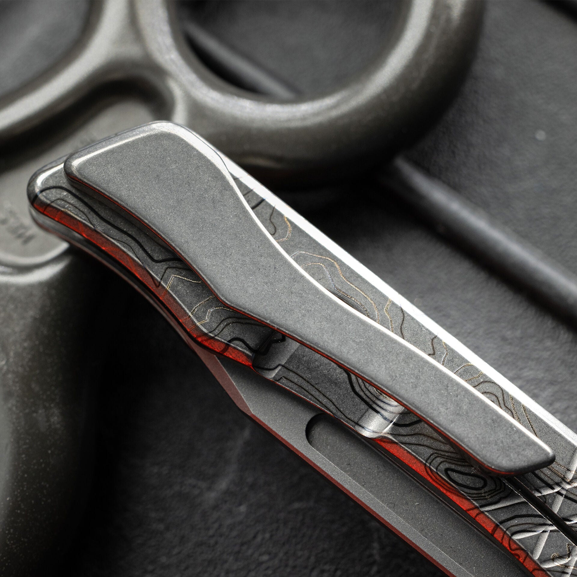 Long thin and lightweight, the titanium handle has a deep front finger groove and handle that widens out to the pocket clip controlling fore and aft movement. The machined titanium pocket clip is attached with blind screws, continuing the clean aesthetic. Finer details include a carbidized lock face for increased wear, and hardened 416 stainless steel pivot for strength. Finally our signature topo pattern and logo are laser applied.
