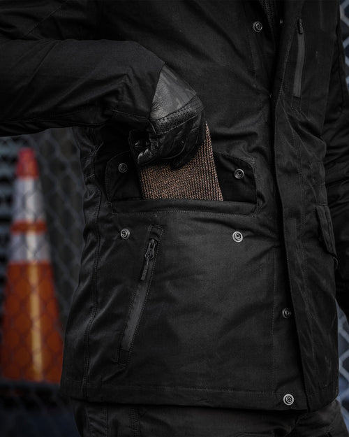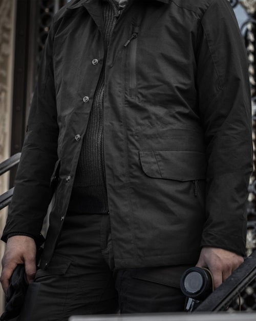 Architecturally simple but deceptively capable, the Sentinel features an array of storage options hidden within its refined lines. Internal and external chest pockets provide both security and accessibility, while classic flap-over front pockets conceal zippered hand pockets for convenient protection against the elements.
