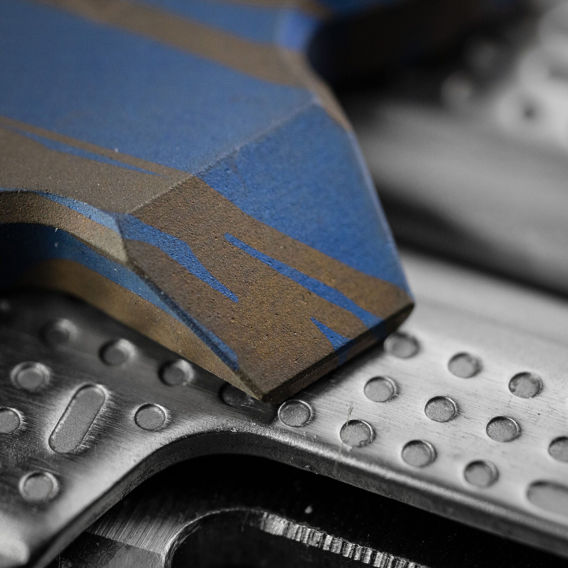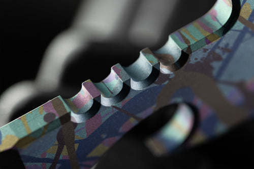 Working from his home garage, Kirsch uses simple tools, sharp discipline, and a deep understanding of the chemistry behind anodizing to create vivid, one-of-a-kind finishes. Each pattern is layered by hand, never laser cut, producing controlled results born from repetition and refined technique rather than automation.