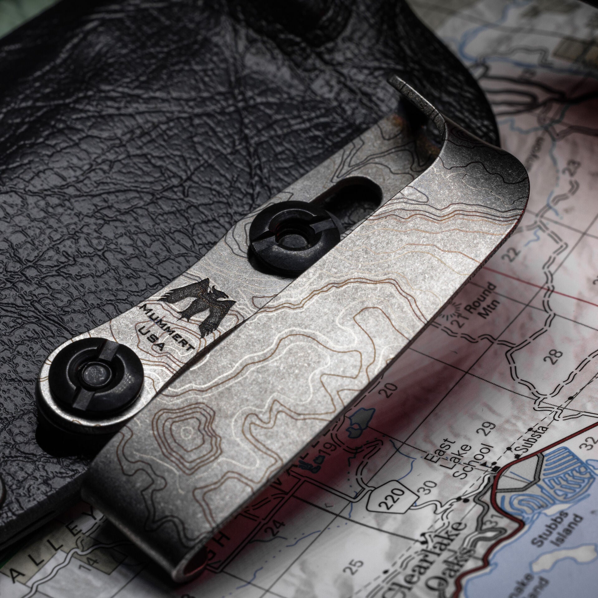 Not happy with the current offerings for high strength and low profile sheath retention, Marc Mummert designed the simple and strong Ti Clip. Custom made out of 6AI-4V titanium, the Ti Clips are hand bent under extreme heat providing solid retention that is guaranteed for life. The design is ideal for IWB as well as pocket carry, and the low profile design helps the tool disappear from sight. Fitting 1’ to 1.5” hole spacing is compatible with most sheaths Our edition comes with our signature topo pattern lasered onto the clip body.