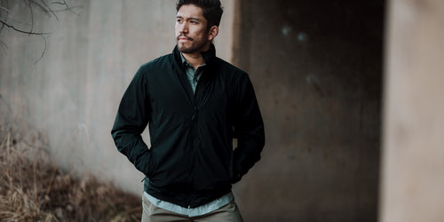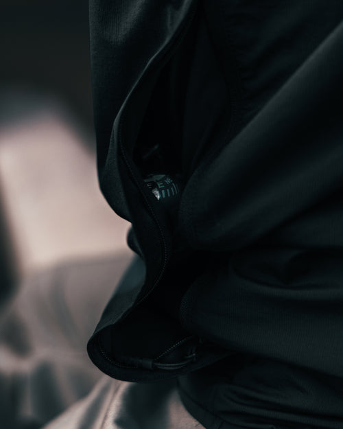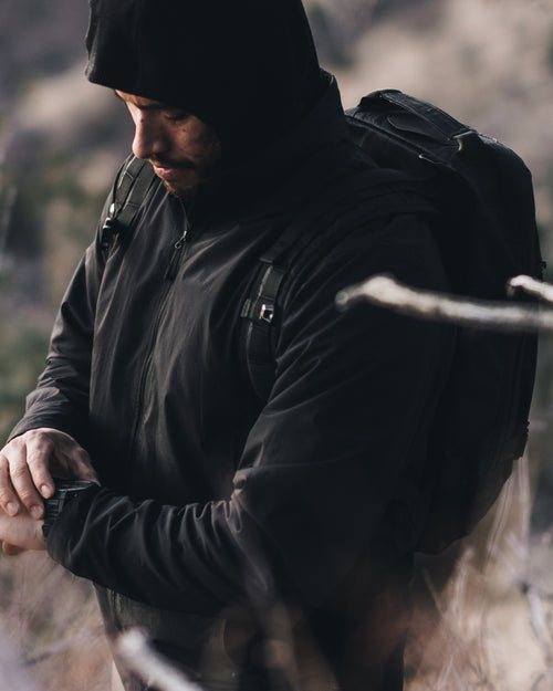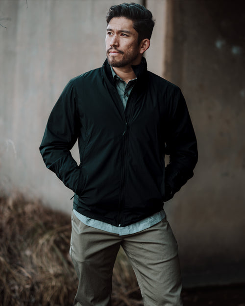 Streamlined storage reduces visual noise without sacrificing capability. Innovative dual stacked front pockets separate secured carry from natural hand placement, with internal attachment points for retention. The wearer’s left internal chest pocket doubles as a stow pocket, compressing the jacket into a compact package sized to fit easily into most water bottle pockets. A reversible slider enables intuitive deployment and repacking.