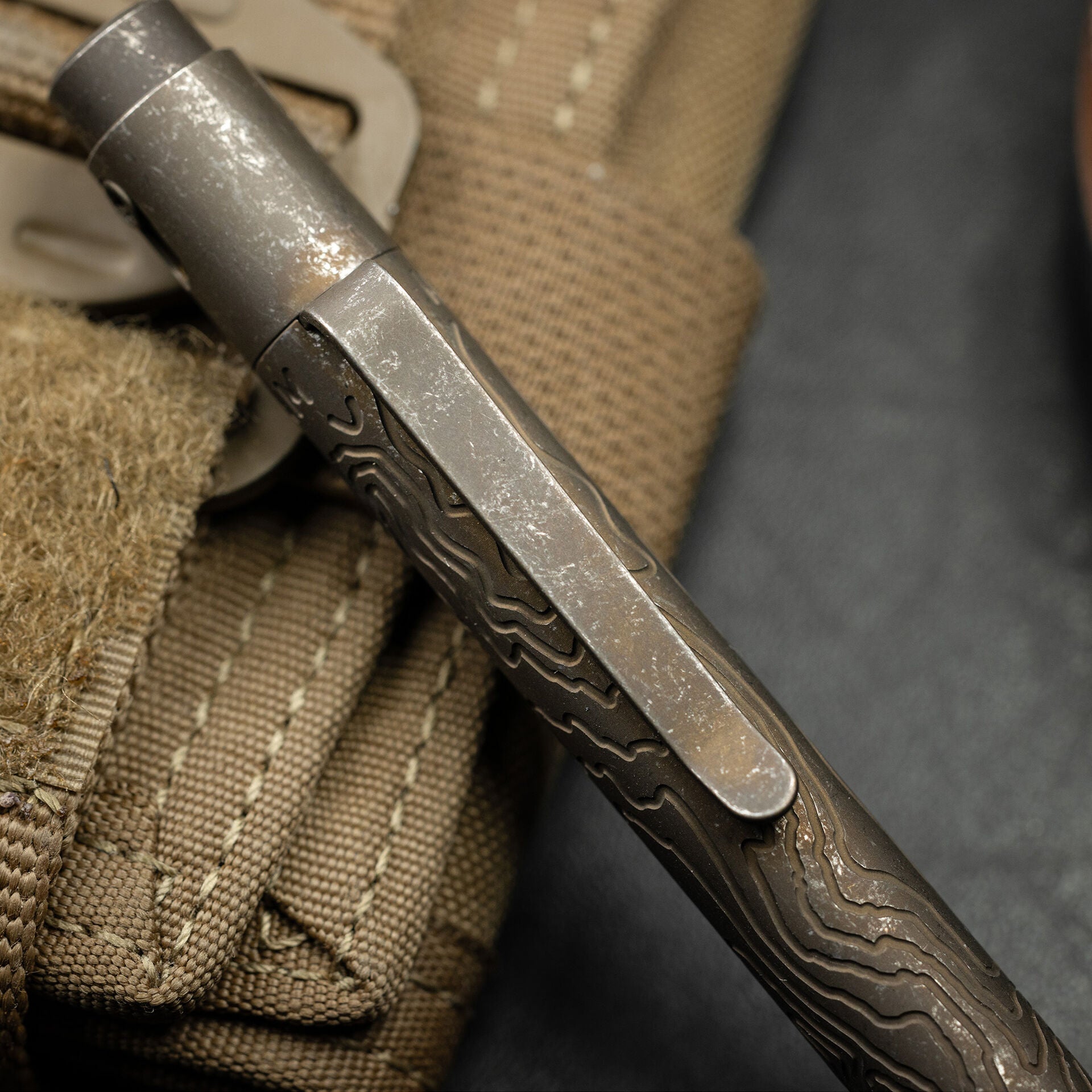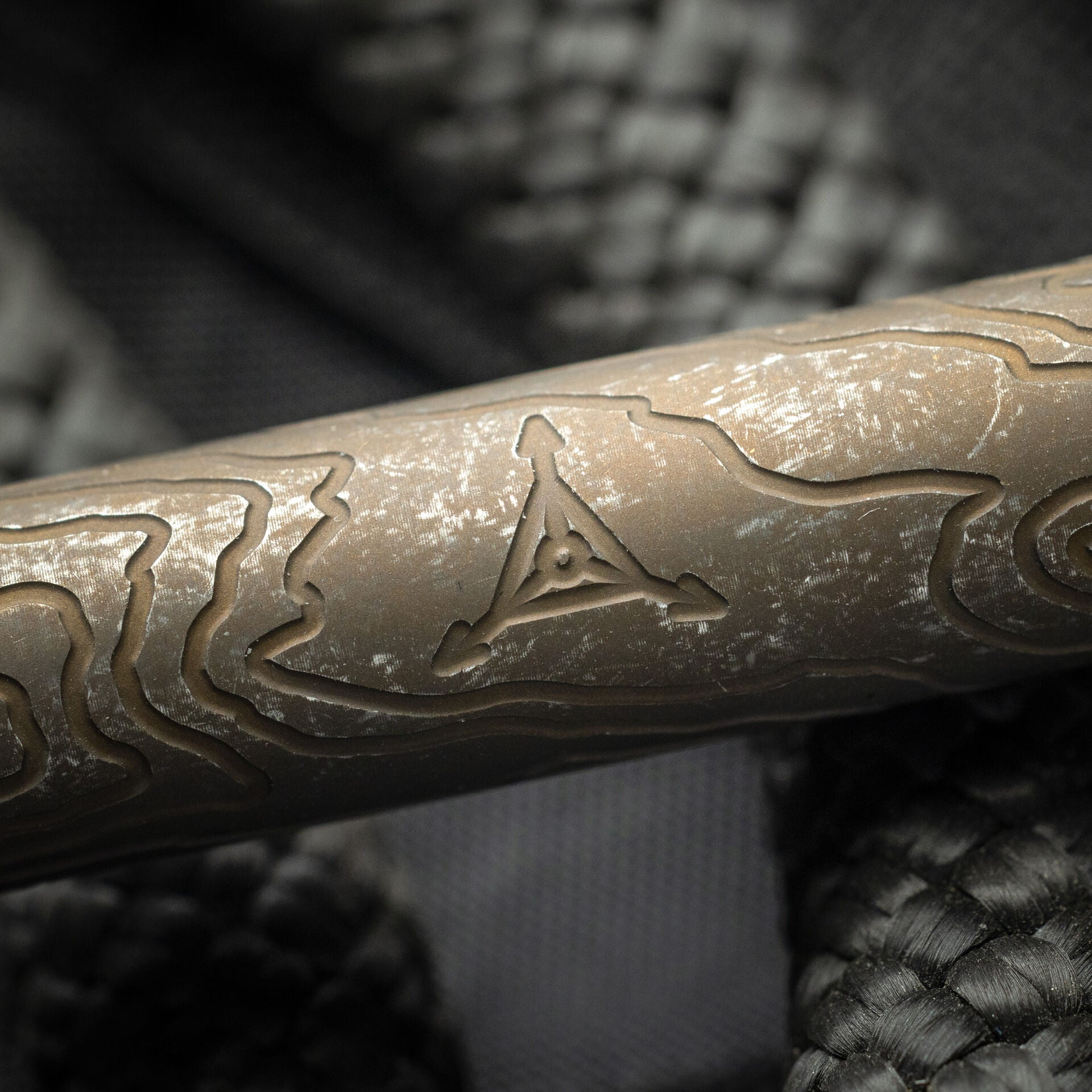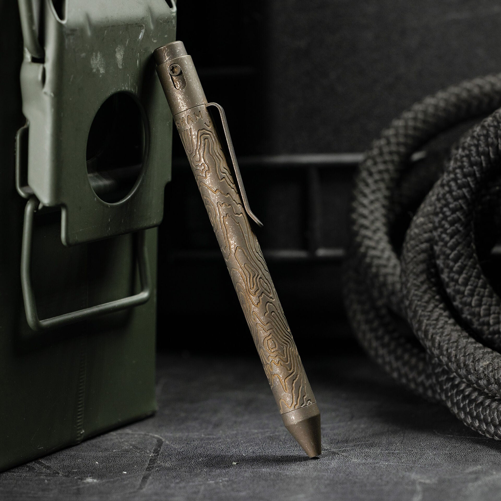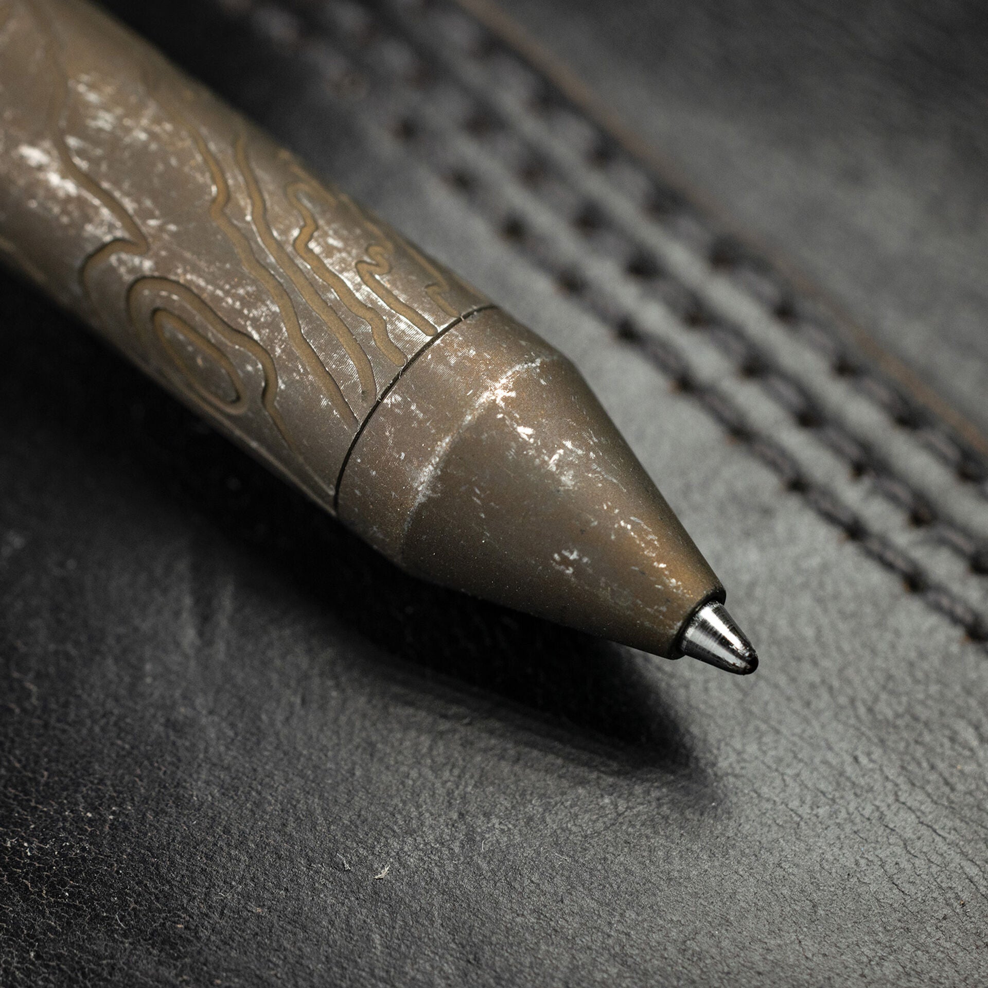 This all titanium variation of the TiButton comes with the labor intensive Battleground finish. It is blasted, chemically etched, anodized and heavily tumbled to a dramatic effect. Our signature topo pattern is deeply milled into the body of the pen.