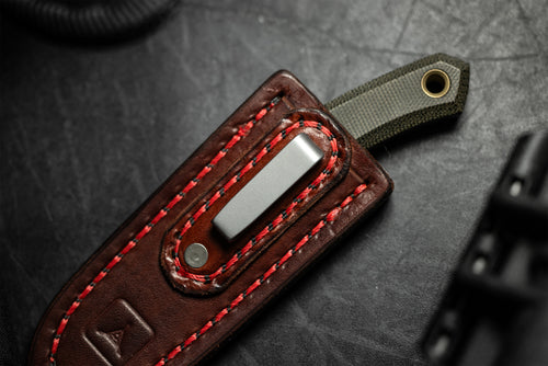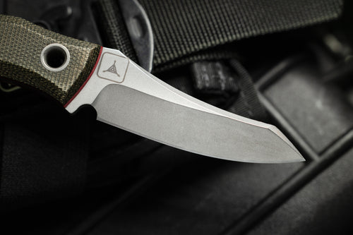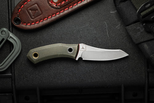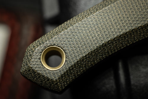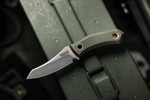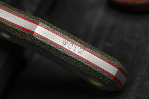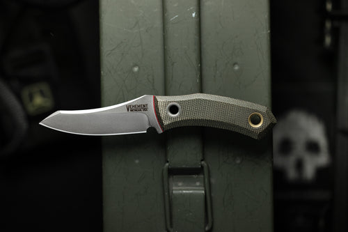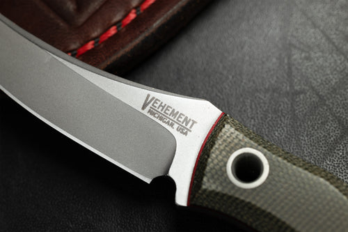 Vehement set out to create a small EDC sized knife that was simple in construction, but nuanced in design. After several iterations they decided on a universally comfortable handle shape, with an emphasis on keeping the handle wide for its overall short length which assures control and safety. Classic OD green canvas Micarta combined with hollow pins and red fiber liners offer the perfect contour and tactile feel.