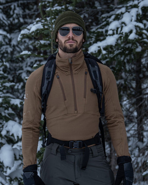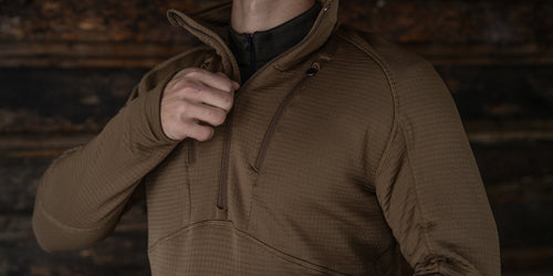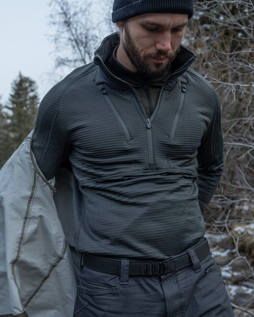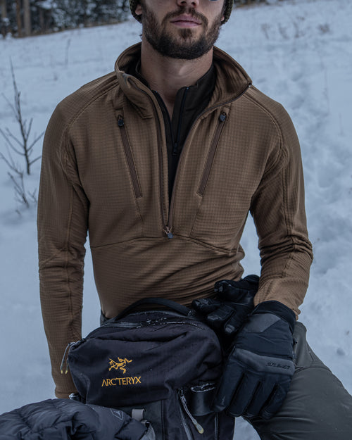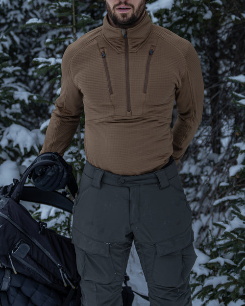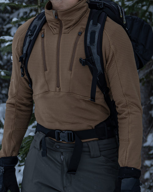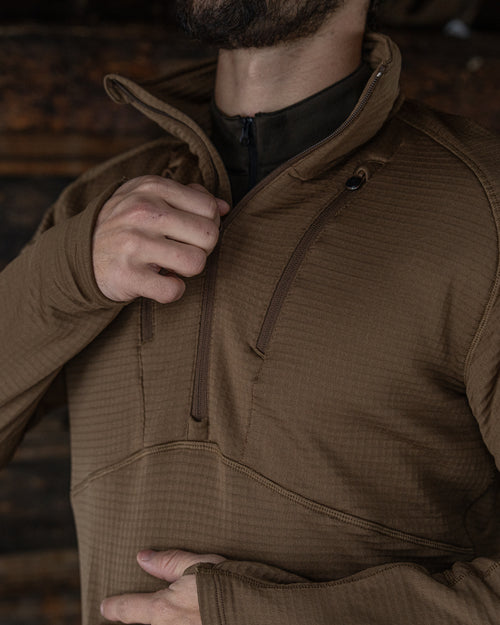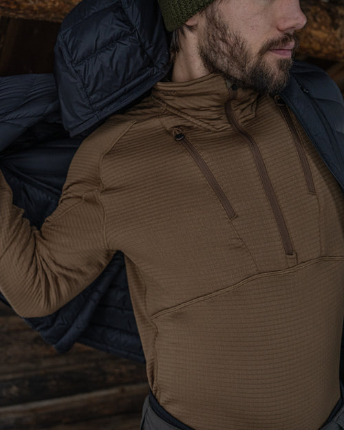 The Vortex Half Zip was engineered to be a thermal constant - reliable across altitude, effort, and exposure. Built from Polartec® Power Grid™, it regulates heat, sheds moisture, and layers cleanly beneath shells and insulation. A piece designed to disappear once worn, doing its work quietly while conditions do their worst.
