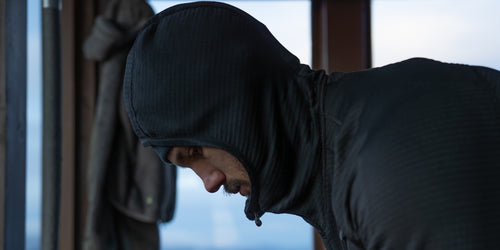 Integrated into a gusseted construction, the thumbholes lay flat and comfortable when not in use and provide secure wrist anchoring when layering.