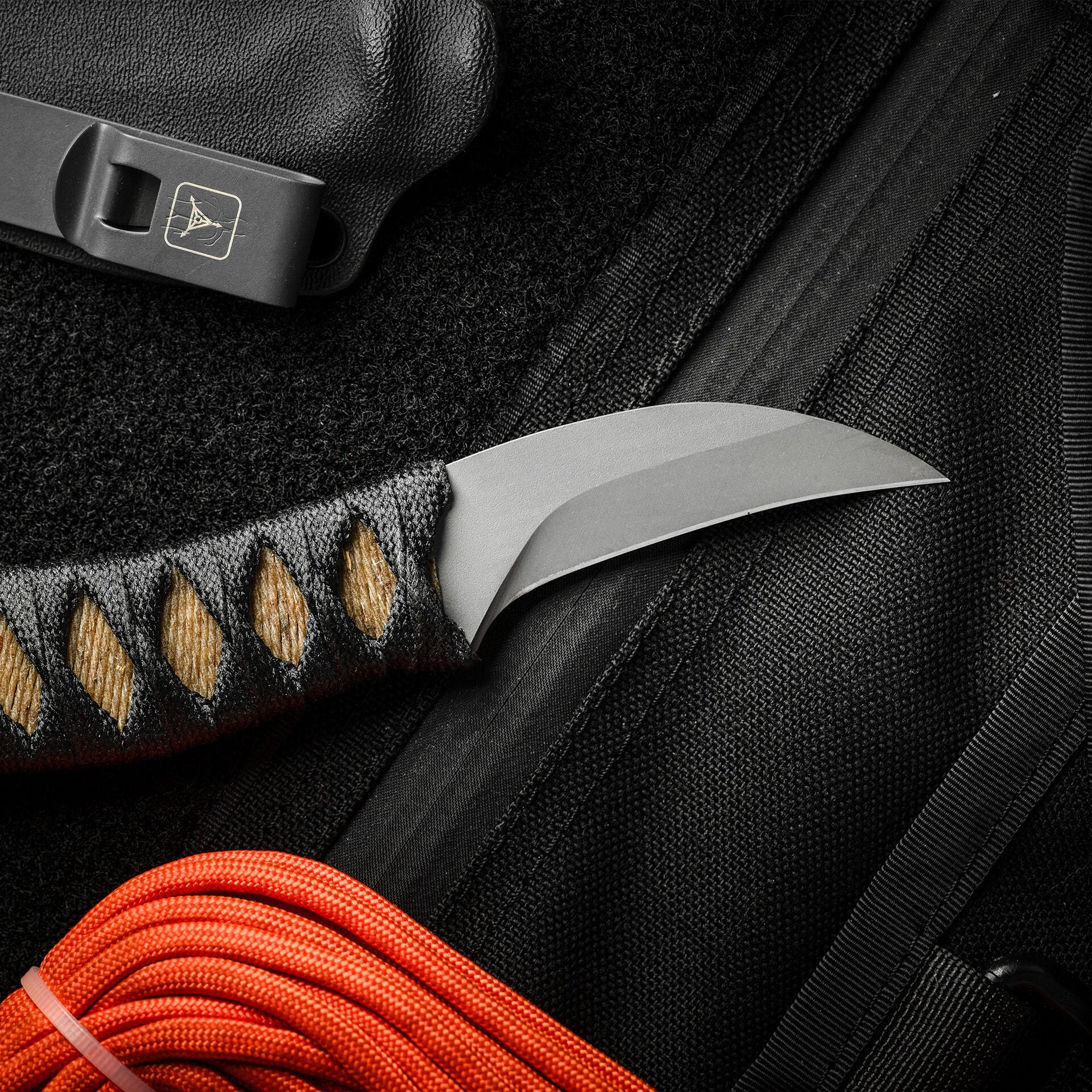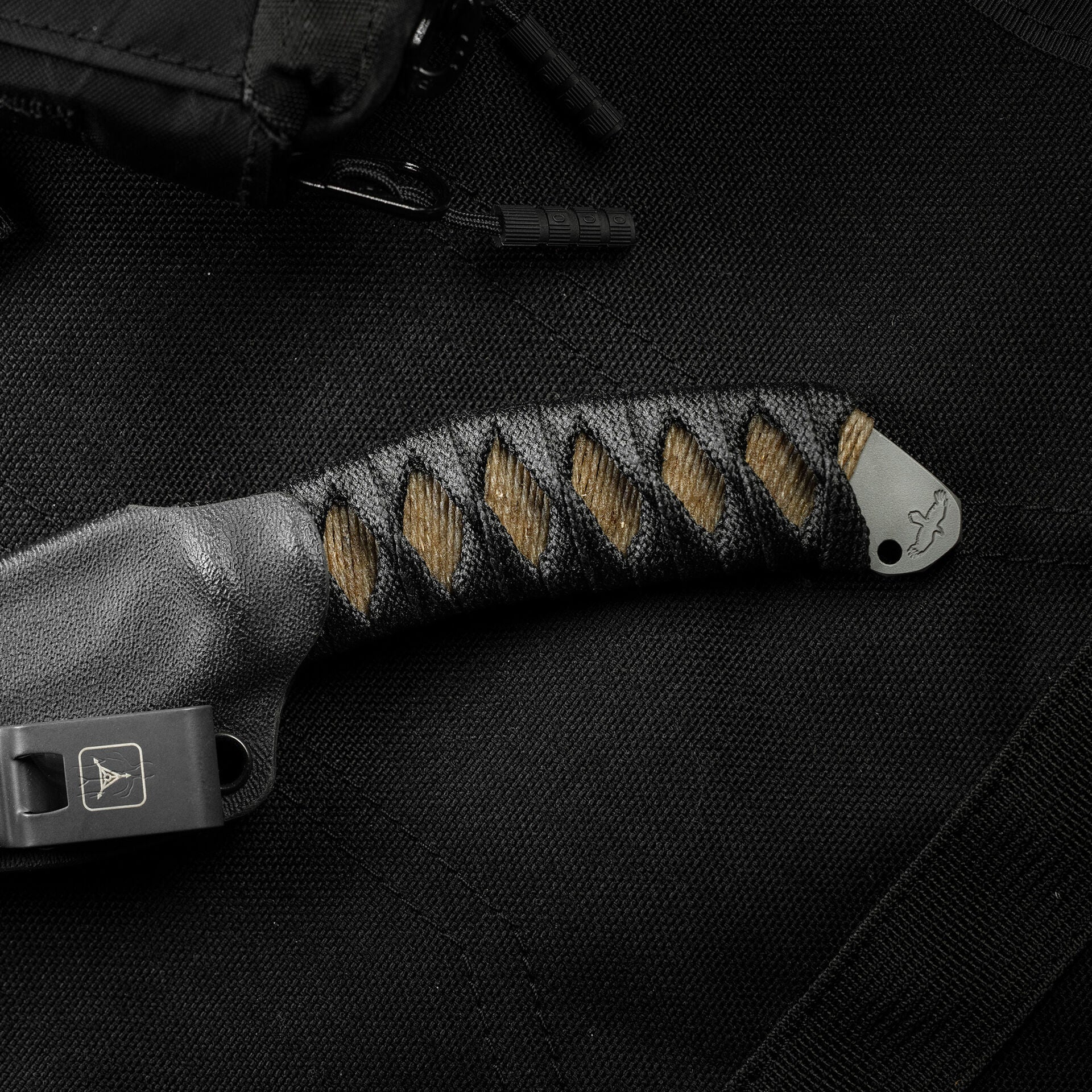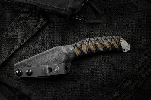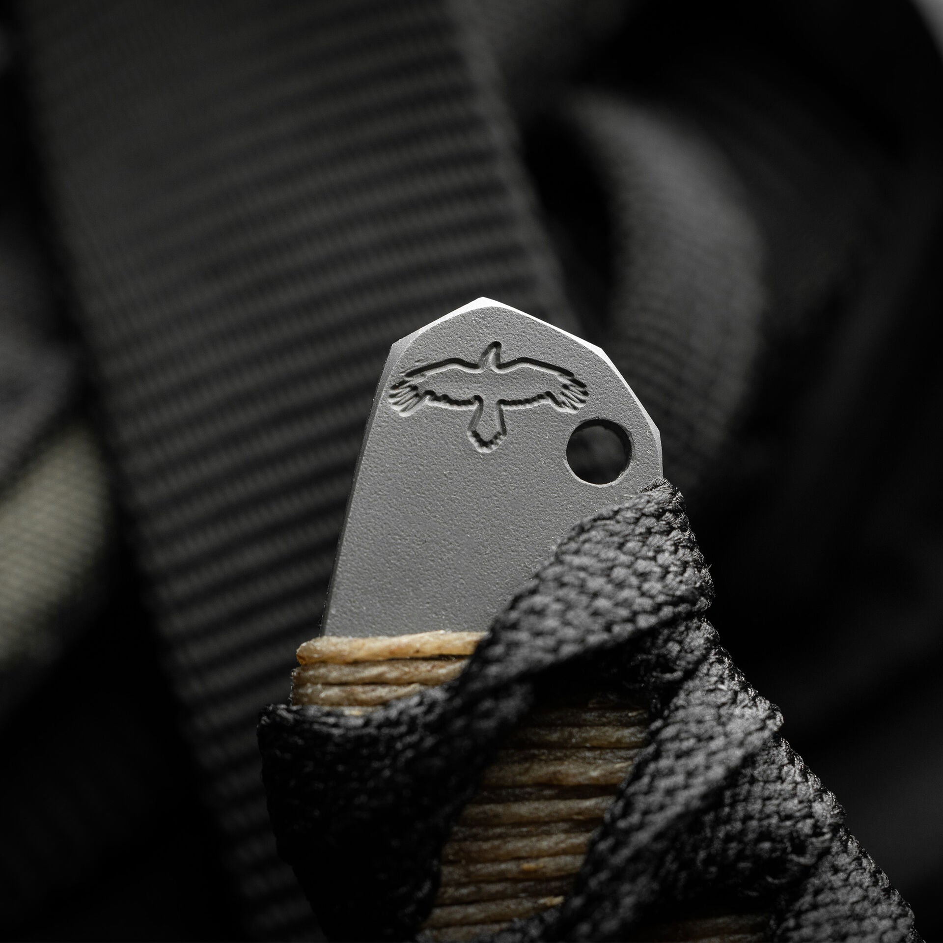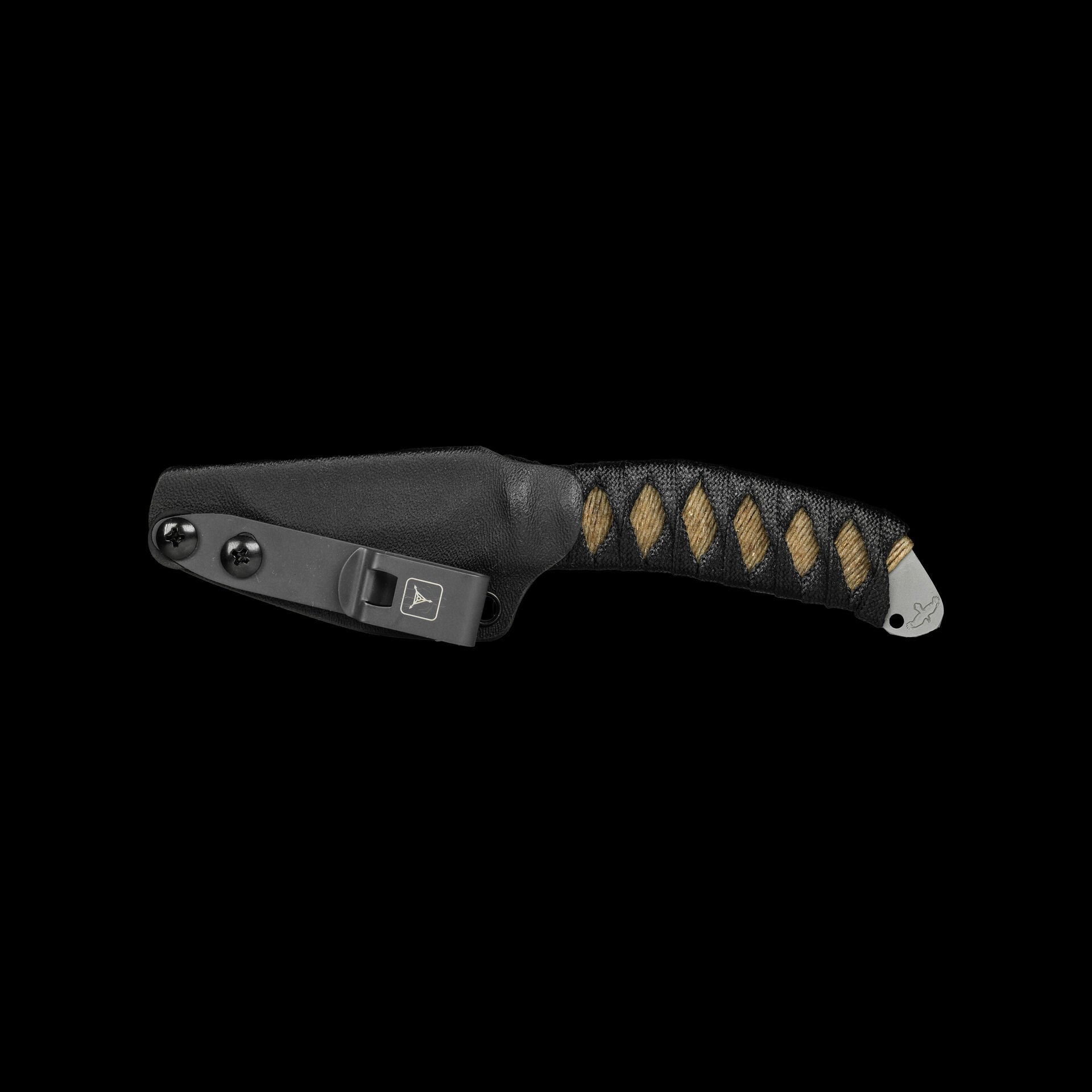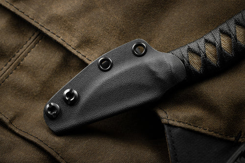 The short reversed edge, matched to a full sized secure handle, make for a powerful emergency cutting tool. Made from sand blasted Nitro V with a Japanese style wrap over jutte, this knife locks in your hand. The Stumpy Joe is small enough to disappear in your daily carry but strong enough to serve when called into action. Designed as a point driven defensive piece this knife is capable of heavy pull-cutting due to its reverse edge, .167” stock and incredibly well thought out handle. The sheath is just as well executed for its purpose. A minimalist fold over style Kydex sheath with a DCC Mod 2.1 clip provides for robust retention and rapid withdrawal when needed. The Windy Raven and TAD logos are on opposing sides of the blade.