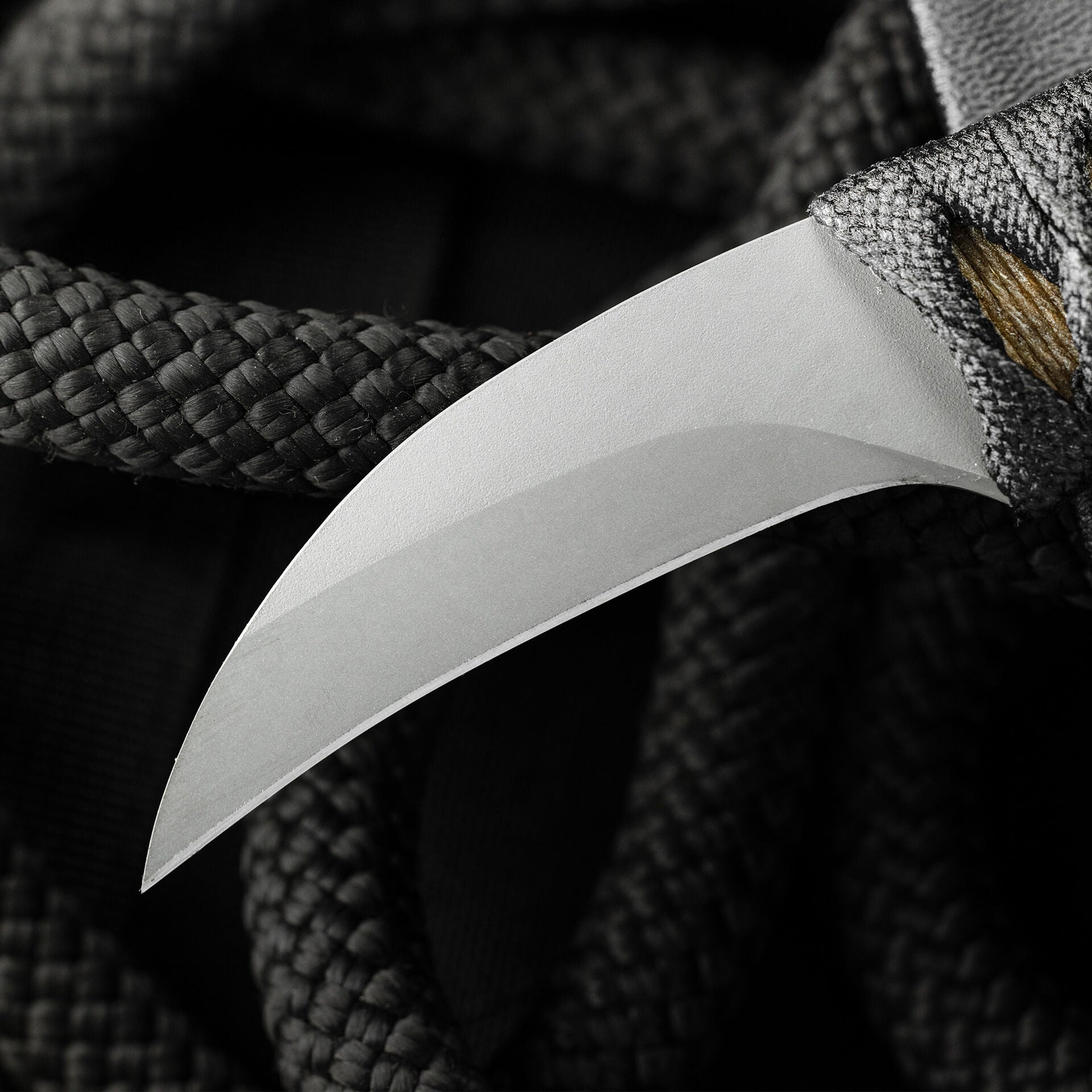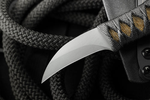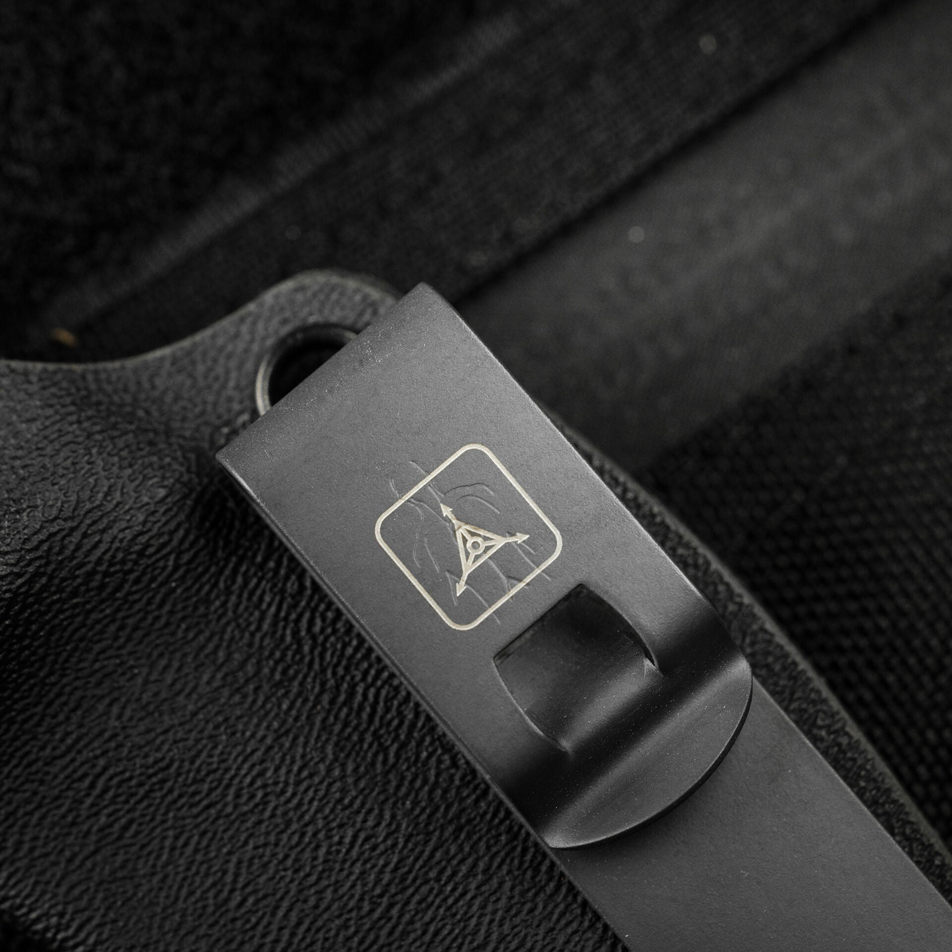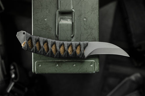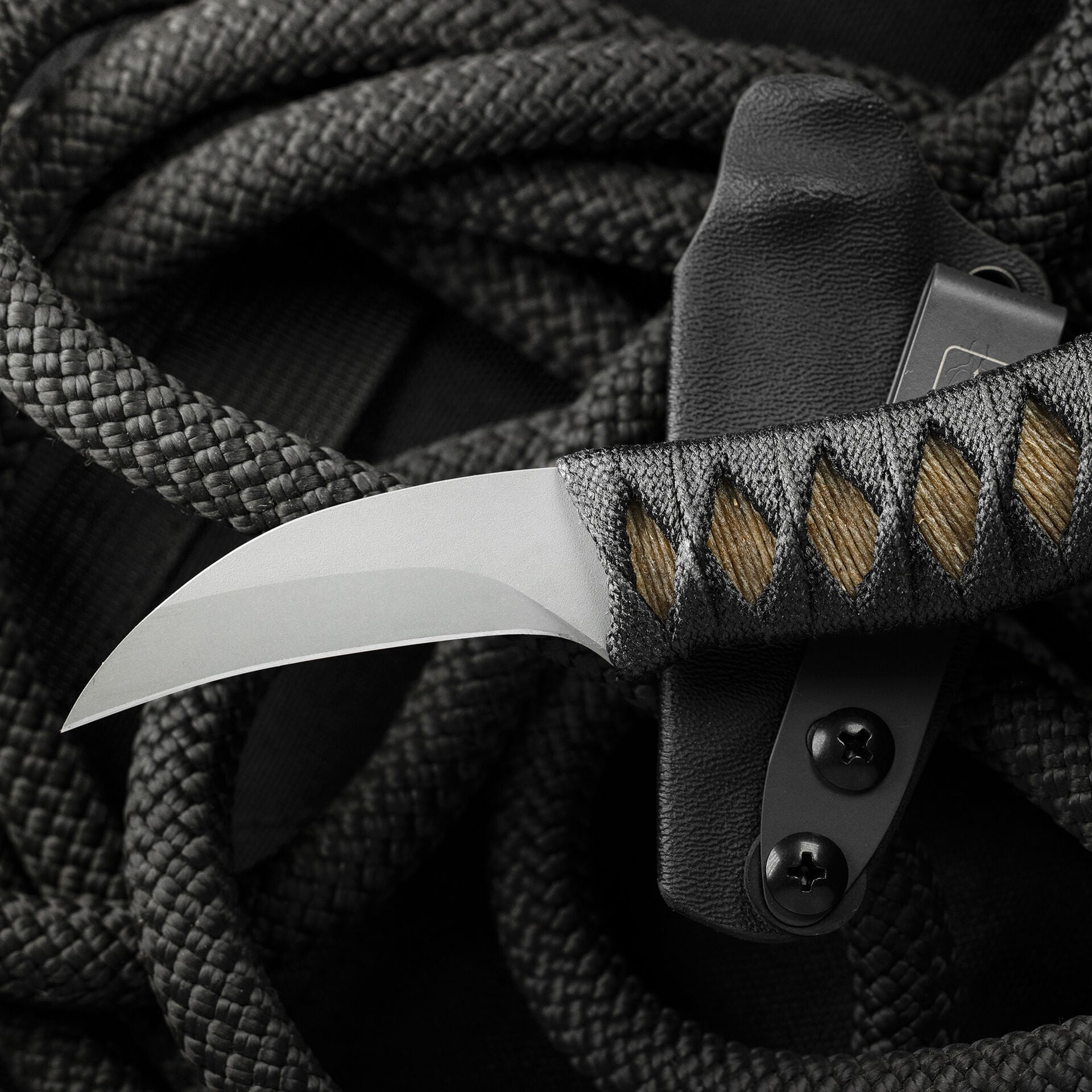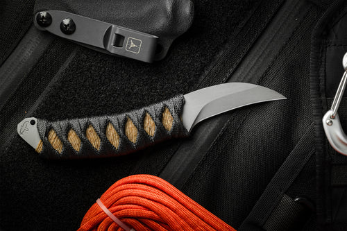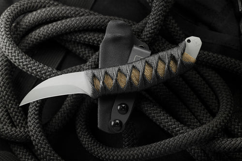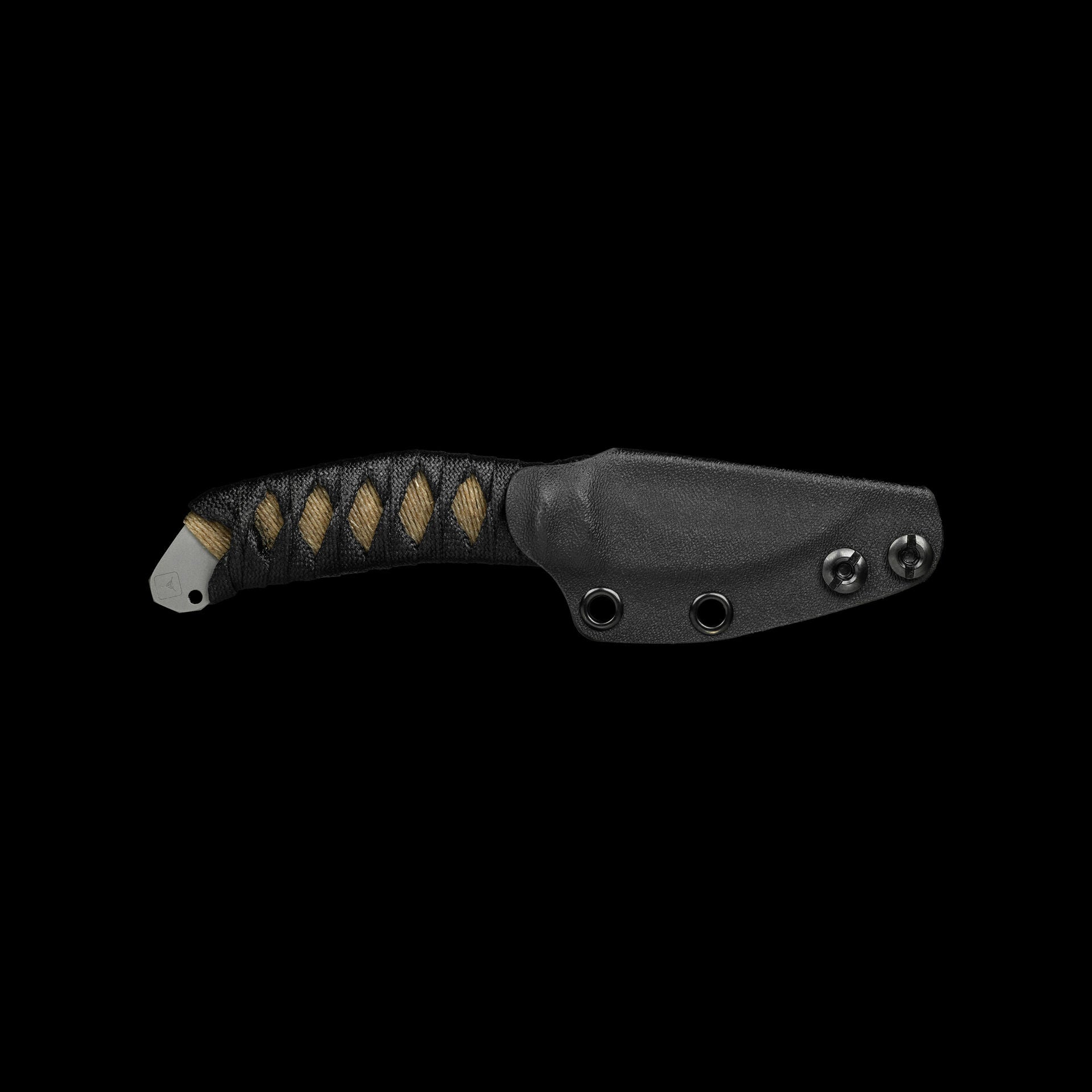 The short reversed edge, matched to a full sized secure handle, make for a powerful emergency cutting tool. Made from sand blasted Nitro V with a Japanese style wrap over jutte, this knife locks in your hand. The Stumpy Joe is small enough to disappear in your daily carry but strong enough to serve when called into action. Designed as a point driven defensive piece this knife is capable of heavy pull-cutting due to its reverse edge, .167” stock and incredibly well thought out handle. The sheath is just as well executed for its purpose. A minimalist fold over style Kydex sheath with a DCC Mod 2.1 clip provides for robust retention and rapid withdrawal when needed. The Windy Raven and TAD logos are on opposing sides of the blade.