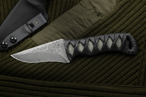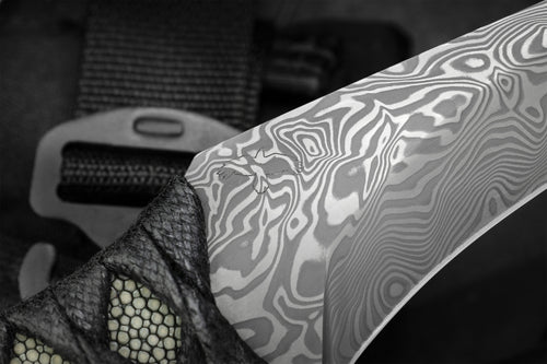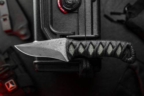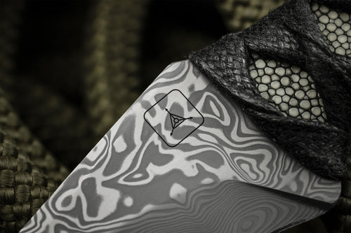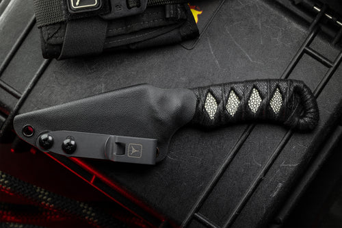 The Wizard Finger is designed with defense in mind, however its well thought out geometry and incredibly secure handle make it suitable for everyday tasks. The sheath is just as well executed for its purpose. A minimalist fold over style Kydex sheath with a DCC Mod 2.1 clip provides for robust retention and rapid withdrawal when needed. The Windy Raven and TAD logos are hand stamped on opposing sides of the blade.