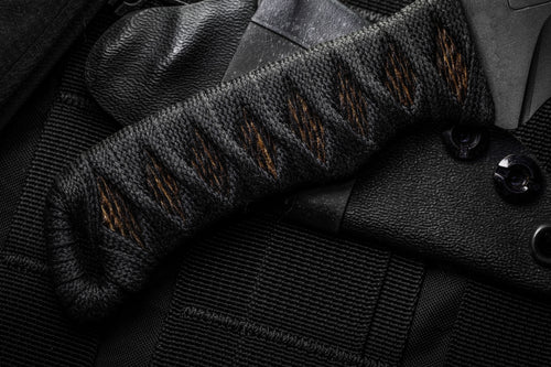 The NitroV blade has been blasted to mute reflection, with nylon wrapped over jute on the handle.