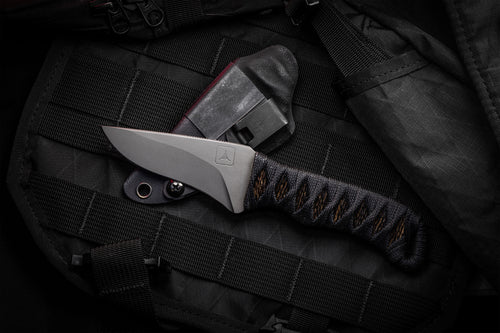 The Wizard Finger is designed with defense in mind, however its well thought out geometry and incredibly secure handle make it suitable for everyday tasks. The sheath is just as well executed for its purpose. A minimalist fold over style Kydex sheath with a DCC Mod 2.1 clip provides for robust retention and rapid withdrawal when needed. The Windy Raven and TAD logos are hand stamped on opposing sides of the blade.